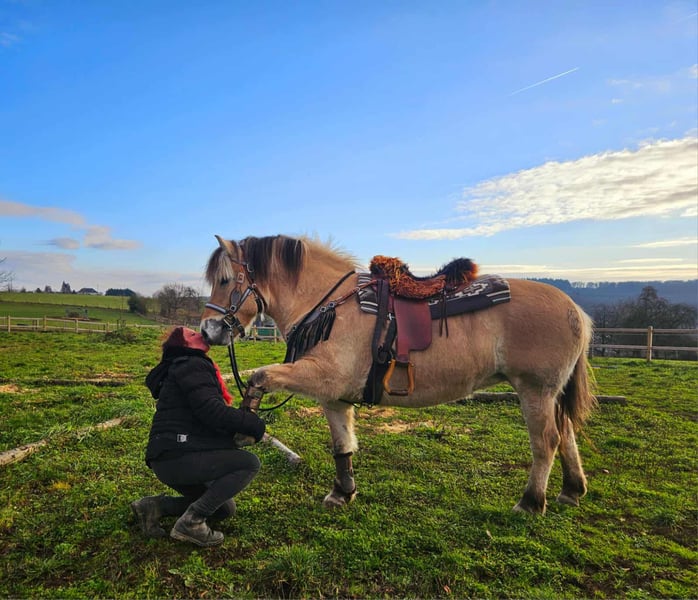 Jolie jument norvégienne de type baroque – douce, calme et polyvalente Âge : 7 ans Taille : environ 1,49 m Prix : 5900 € AKU : disponible ✨ Description : Cette jument séduit par son tempérament équilibré et sa nature amicale et agréable. En interaction quotidienne, elle se montre obéissante, proche de l’humain et facile à gérer. Malgré son jeune âge, le cheval se présente calme, posé et résistant au stress. Sous la selle, elle travaille de manière coopérative, apprend vite et est fiable. Elle prend plaisir à collaborer, reste attentive et procure une sensation de monte sûre et détendue. Elle est particulièrement polyvalente pour le loisir et le western. 🐎 Parfaite pour : Les cavaliers et cavalières recherchant un partenaire de loisir simple, amical et fiable. Grâce à sa taille agréable, elle convient aussi bien aux jeunes qu’aux adultes de petite stature. Idéale pour les balades, randonnées et sorties en extérieur. 🩺 Nos chevaux sont régulièrement : – vermifugés – entretenus par le maréchal-ferrant – contrôlés osteopathiquement 🛍 Boutique : Selles western, brideries et accessoires 🚛 Transport et équipement organisés à prix avantageux sur demande Notre service : ✅ 3 mois de droit d’échange ✅ Essai : 35 €, chaque cheval supplémentaire 25 € (à déduire lors de l’achat le même jour) ✅ 100 € de remise immédiate pour retrait ou transport le jour même ✅ Conseils personnels et honnêtes 📞 Pour toute demande, uniquement par téléphone : 0171 – 4001968 🕗 Disponible tous les jours de 8h à 20h ⚠️ Pas d’e-mails ni de WhatsApp ⚠️ Toutes les informations sont données sans garantie