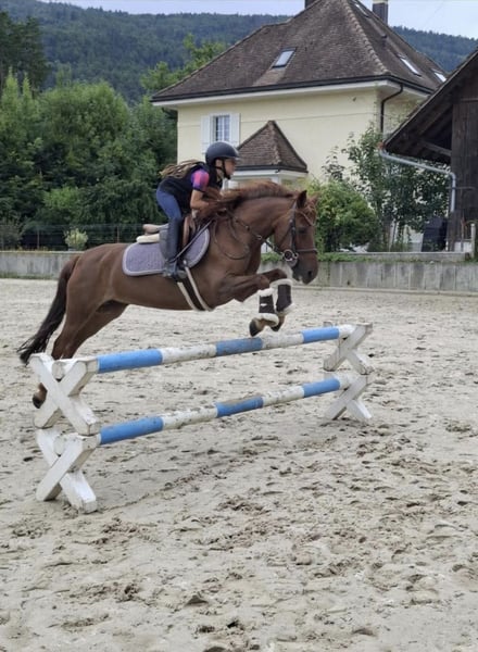 Age: 13 years Breed: Pony of the C jumping type Suitability: Ideal for show jumping, dressage, and trail riding Health: In top condition, regularly attended to by farrier and veterinarian Character and suitability: This wonderful mare loves to jump and demonstrates great talent and courage. She reliably clears all obstacles and always shows willingness to perform. She is confident in open terrain and enjoys her outings. She has her own mind and is therefore not suitable for beginners, but perfect for an experienced rider who can further develop her skills across various disciplines. In dressage, she is well-trained and moves nicely under saddle. She enjoys her work and is eager to take on new challenges. Horsekeeping: She is easy to care for and enjoys social contact with other horses. She thrives in pasture turnout and has no issues with loading. She also handles farrier visits without problems. Price on request. If interested or for further questions, please do not hesitate to contact us!