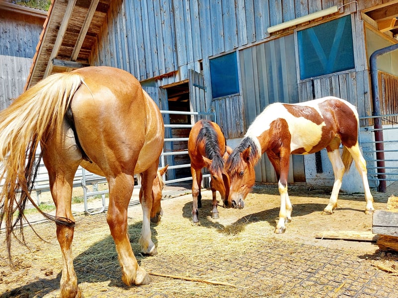 The mare is suitable for leisure riding as well as as a nurse mare, having already fostered two foals. I can easily imagine Andorra as a companion horse. She has not taken a field test, as she has not been worked in that context, but she is eager to learn and would welcome some variety. She is gentle, calm, and affectionate. She is familiar with dogs, cows, children, and is also accustomed to agricultural machinery. Andorra definitely has potential. Despite the absence of a field test, she has been ridden a few times without a saddle.