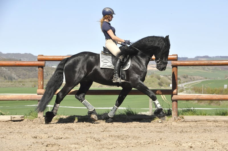 Ein sehr lieber Friese NL mit einem tollen Charakter! Er hat ein gutes Exterieur und eine sehr lange Mähne. Auch wenn er Hengst ist, hat er kein Hengstverhalten. Er ist eher wie ein Wallach, was sehr angenehm ist, auch in fremder Umgebung. Er ist in den 3 GGA geritten, mindestens auf A-Niveau, wobei er auch den Außengalopp läuft. Er hat einen normalen Fleiß, nicht zu fleißig aber auch nicht zu faul. Er kennt ausserdem auch das Gelände und den Straßenverkehr. Ausritte in der Gruppe oder alleine meistert er gut. Er ist auch 1 / 2 / 4spännig gefahren. Anfragen bitte ausschließlich telefonisch.