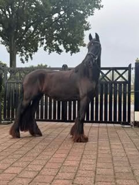 Stunning, exceptionally honest 100% correct Friesian mare Here she is: Marina! (birth name Maria) Her honest, trusting eyes immediately reveal that this mare has an extremely reliable character. This is one of the few horses where there is truly nothing to criticize. Very honest, calm, and sweet. She has three beautifully correct, elevated yet comfortable gaits, making her very suitable for sport. She holds a recent inspection report, including blood test, with approval for sport without any remarks. She is completely free of any faults. Currently approximately 1.58 meters tall. Marina was born on May 5, 2021, in Spain! In the Netherlands, she has had a foal. The owners chose to keep the foal, so Marina is now available to a new loving owner. She has been shown for carriage driving, see the video. We ride her dressage regularly and recreationally, and she performs wonderfully; she has not put a single wrong foot. This is a black pearl. A one in a thousand. €8,750 incl. brand saddle and bridle