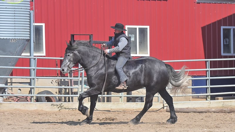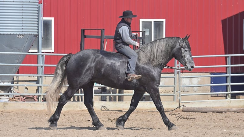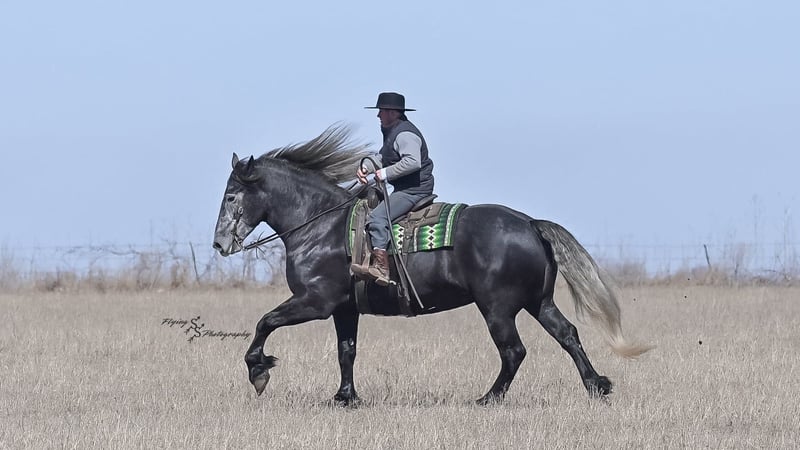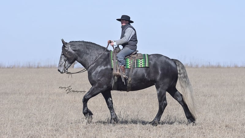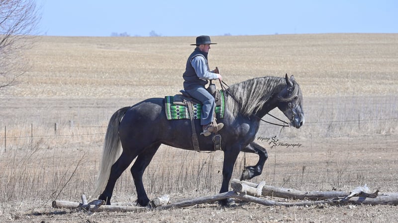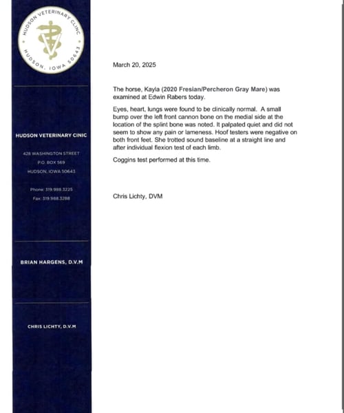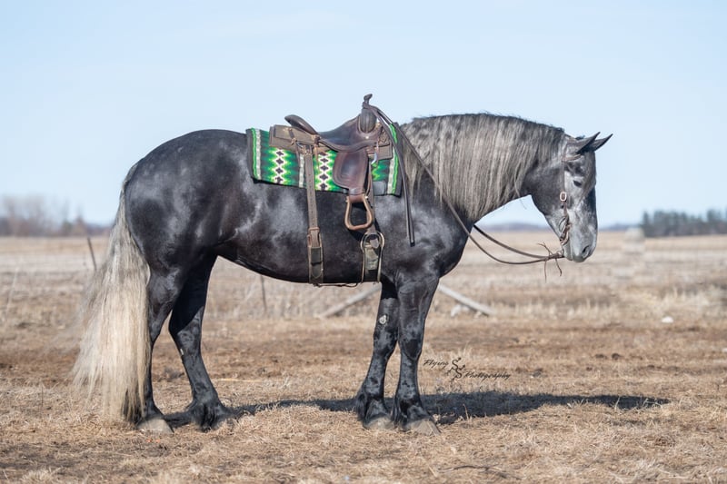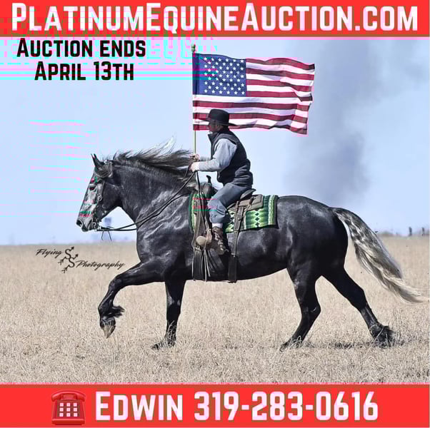ONLINE AUCTION Place your bids at www.PlatinumEquineAuction.com Starting Bid $3500 Auction ends April 13th, 2025 Need a new saddle? Check out White Rock Saddles on our website or Facebook! If you’re looking for a show stopper, look no further! Kayla is a 5 year old registered Friesian Sporthorse. She is a knockout cross between a Friesian and a Percheron. Kayla stands 16.3 and has conformation that is as beautiful as her gray color. She rides well in the arena and outside on the trails. Kayla is traffic safe, and is used to being around other large and small livestock as well as pets and children! She will ride through an open field, down the trails, across water, through all obstacles, and down busy highways. Kayla will one-hand neck rein or plow rein, she is very soft in the bridle and leg cues. She knows how to side pass, pivot, lope correct circles picking up her leads, open and close gates, can be mounted from a mounting block or fence, and so much more! Kayla is easy to catch and does well in a stall or pasture setting, plus gets along well with other horses. She is quiet, gentle to be around, and so easy to handle. She easily picks up all of her feet, and is good for the farrier. Kayla could go so many directions, and has an excellent foundation to take her there. Whether you want to ride western, english, bareback, or simply trail ride, she is a great fit! Along with all of her experience in western riding, Kayla has been started in dressage and jumping. She is doing great with lead departures and laterals. Kayla moves beautifully, and definitely has a natural talent. She is not for a beginner, but is ready to go any direction in her training. Kayla is a very well rounded mare that will make someone a very high caliber horse! Even with time off, in the pasture or a stall, she rides off great. This outstanding mare has a solid foundation and stays honest whether she is being handled under saddle or on the ground. Kayla is current on Coggins, and also has a current PPE on file. If you have any questions, or would like to meet Kayla prior to the auction ending, please call Edwin Raber 319-283-0616 we are located in Fairbank, IA. ONLINE AUCTION Place your bids at www.PlatinumEquineAuction.com Starting Bid $3500 Auction ends April 13th, 2025 Need a new saddle? Check out White Rock Saddles on our website or Facebook!