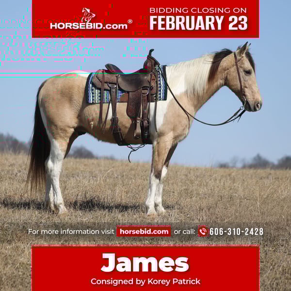 💎 𝐓𝐇𝐄 𝓓𝓲𝓪𝓶𝓸𝓷𝓭 𝐒𝐇𝐎𝐖𝐂𝐀𝐒𝐄 💎 Happening now thru MONDAY | FEBRUARY 23rd - Available EXCLUSIVELY on HorseBid's website! For more details and to register visit: www.Horsebid.com CONSIGNOR CONTACT: Korey Patrick 606-310-2428 LOCATION: Brodhead, KY BREED: Friesian Cross REGISTERED: No REGISTERED NAME: COLOR: Buckskin Tobiano HEIGHT: 15.3 AGE: 10 GENDER: Gelding If you want color, class, experience and a nice ride... James is your guy! James is a super cool, buckskin tobiano, Friesian Cross gelding that is standing around 15.3hh and he is very well built. He is 10 years old and he has all the good looks, and with miles of experience to go along with it! James has been trail ridden throughout Kentucky, Tennessee and Virginia and he knows all about traveling and trails. He will cross creeks, ditches, logs and navigate rough rocky areas. He moves around real nice and is content to plod along down the trails as well! He has been exposed to all kinds of wildlife such as deer or turkey and will go anywhere that he is asked too. He will go up or down even the steepest slopes, across deep creeks, over downed trees, and over all types of rough terrain while still being sure footed. James has been ridden down the highways and is traffic safe. He is not cinchy, cold backed, does not crib or weave. If you want flashy, substance and safe... James is a great choice! Feel free to call Korey Patrick 606-310-2428 with any questions. Located in Brodhead, KY