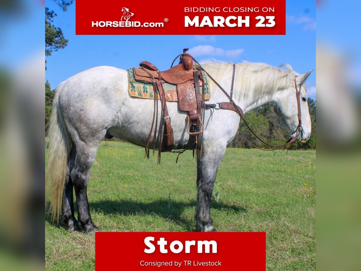 ⚜️𝓽𝓱𝓮 𝐆𝐎𝐋𝐃 𝓢𝓮𝓵𝓮𝓬𝓽⚜️ Happening now thru MONDAY | MARCH 23rd - Available EXCLUSIVELY on HorseBid's website! For more details and to register visit: www.Horsebid.com CONSIGNOR CONTACT: TR Livestock 605-370-4644 LOCATION: Rusk TX BREED: Friesian/Percheron cross REGISTERED: No COLOR: Gray HEIGHT: 16.2 AGE: 10 GENDER: Gelding Storm is a 10 year old gray draft cross (1/2 Percheron — 1/2 Friesian) gelding standing 16.2 hands tall. If you’re looking for a talented and steady crossbred, that is smart and always aims to please here he is! Storm has a lot of ability in the arena , he has smooth transitions and is good both inside and out! Storm is great on the trails, goes through water, different terrain and over obstacles. He has been used around cattle for being ranch work such as gathering, penning and even sorting! He will ride out alone or in a group and even has been rode in town! He stands tied, loads, bathes. He’s easy going and an easy keeper! Storm is a very unique cross with the large build and size of a Percheron and also the mind and beautiful movement of a Friesian making him a super cool cross to take to the show pen in the dressage or jumping! Or continue to use him on the ranch and the trails! If you’re looking for gentle as well as athletic ability in a draft cross that is easy to get along with here he is! Call or text TR Livestock 605-370-4644 (Rachel) for more info! Located in Rusk TX, nationwide shipping available!