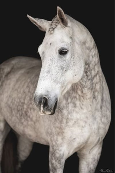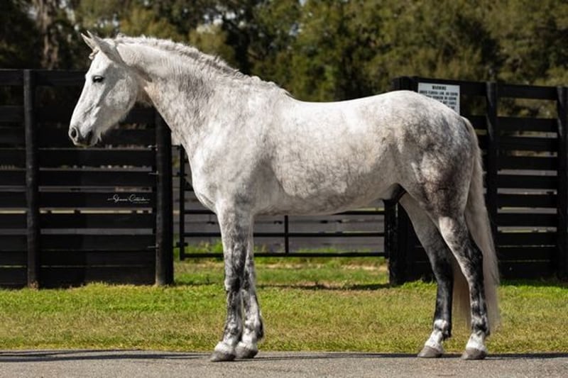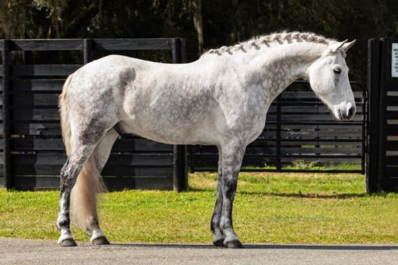 ONLINE AUCTION PLACE YOUR BIDS AT PLATINUMEQUINEAUCTION DOT COM $3500 STARTING BID AUCTION ENDS JUNE 30TH Aladdin is a gorgeous grey 9yr Friesian x Andalusian gelding standing 16.1h. Aladdin trains in dressage and has been to several big shows including the World Equestrian Center. He has shown at training level and also schools leg yielding, shoulder-in, travers, reinback, turn on the haunches, simple changes, and collections and extensions within the gaits. Aladdin is a brave and curious horse, always well-mannered in new places. He cross trains in jumping, cross country, trail riding, and trail obstacle. He would be a great prospect for working equitation or eventing. Aladdin is a sweet boy with a big playful personality. Always a doll for grooming, bathing, tacking, clipping, etc. He is up-to-date on shots, Coggins, floating, deworming, sheath cleaning, and hoof trimming. If you have any questions about this beautiful dappled grey Friesian x gelding, please call Show Me Sport Horses Rachel 352-467-5695. Aladdin is located in Ocala, Florida and shipping can be arranged anywhere in the country.