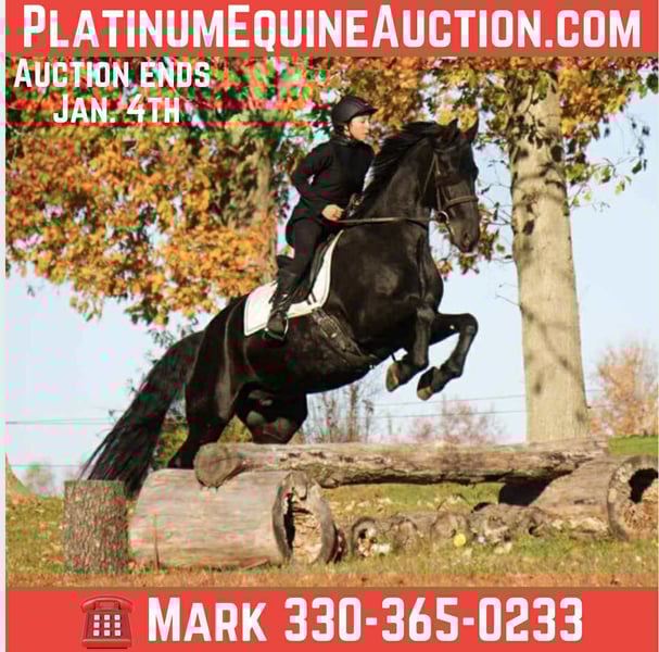 Rizzo Is a total dream horse that will get heads turning no matter where you take him. He is a 16.3 2015 Friesian Sporthorse (Friesian/Percheron/Morgan) gelding. He rides English and Western.. Rizz rides great on the trails as well as the arena.. We ride great by himself as well as with a group.. Rizzo has no funny business and enjoys having a job and is extremely willing. He has a solid W/T/C both directions. He has a ground covering stride and pretty movement. strives to please and has work ethic. He is schooling First/Second level. Scoring First level tests in the 70’s. Jumping 3ft courses with changes, with plenty of scope. He has no buck rear or kick. He loves to trail ride and crosses all obstacles. He had been Fox hunted frequently and hunted first and second with no issues. On the trail, Rizz will happily go in the front or back of the pack. This brave boy is the first one into the water, be it crossing the stream, or going for a swim in the lake. He’s good in a group with horses riding up close behind him and doesn’t get upset. In the barn, Rizz has no bad stall habits He picks up all four feet and is good for the farrier. He stands to groom, clipped and saddled. He never causes problems in the pasture and gets along with everyone. He is a gentleman no matter the situation I trust him to take care of any level rider. Has been lightly used in lesson program and is my guest/friend/family horse for any trail or outing with inexperienced riders. Located in Fresno, Ohio. Call or text Mark with MW Equine 330-365-0233
