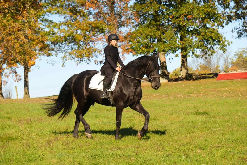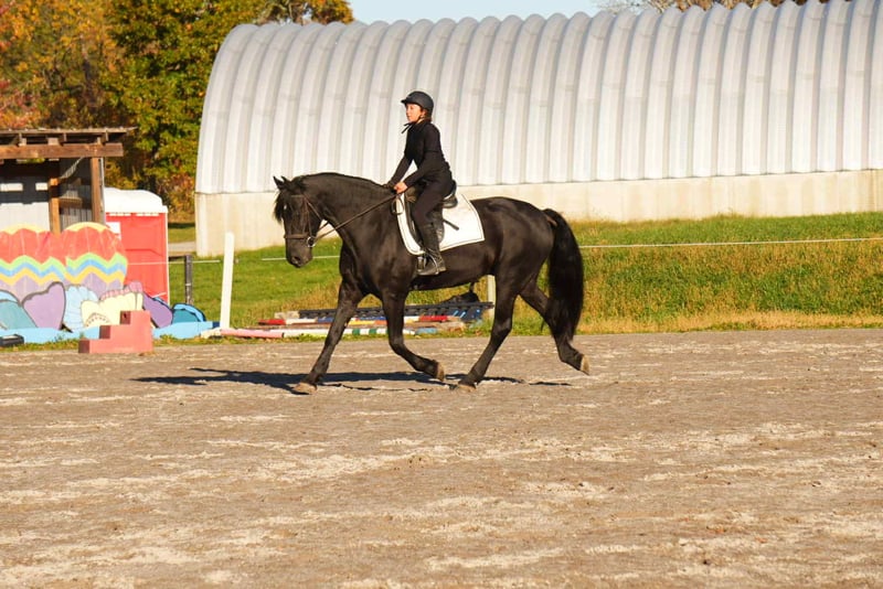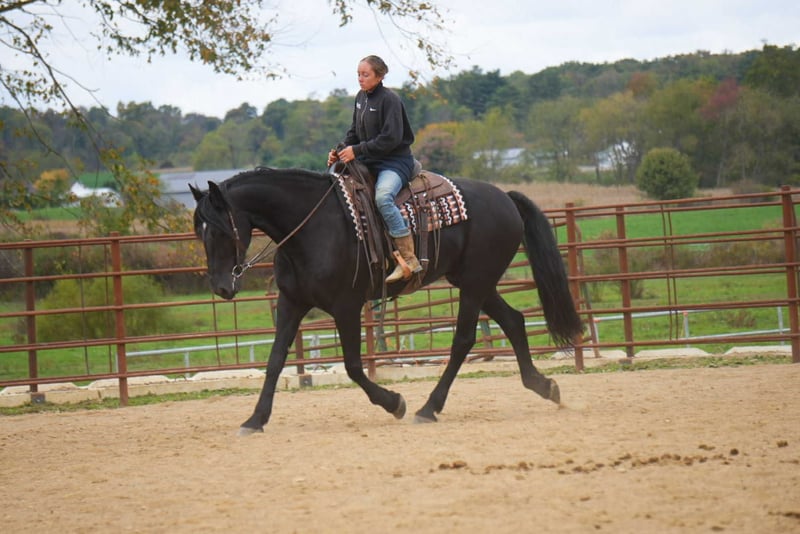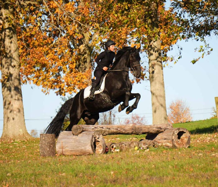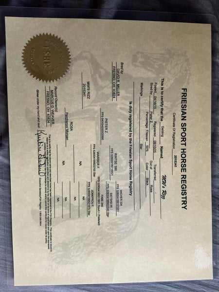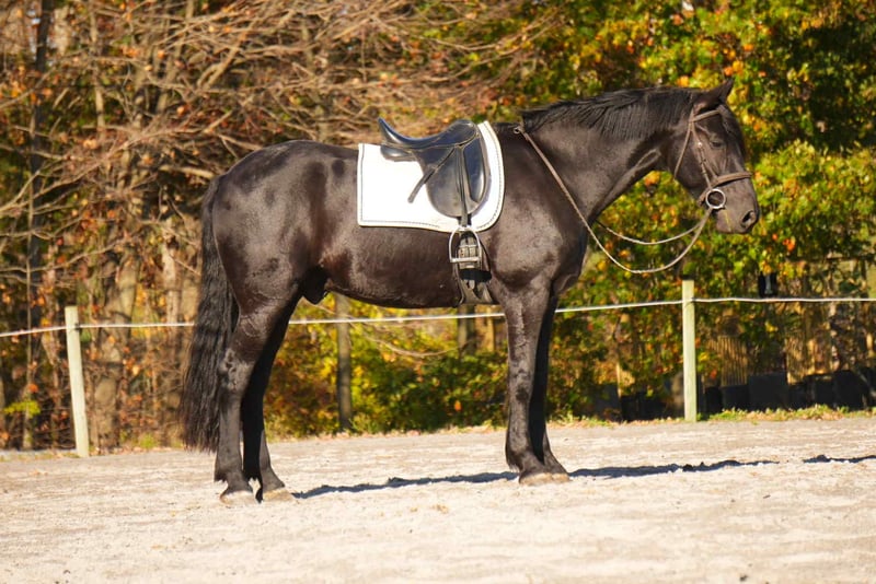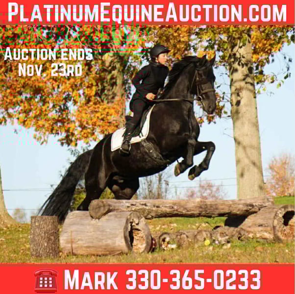 ONLINE AUCTION Place your bids at www.PlatinumEquineAuction.com Starting Bid $3500 Auction ends November 23rd, 2025 Need a new saddle? Check out White Rock Saddles on our website or Facebook Rizzo Is a total dream horse that will get heads turning no matter where you take him. He is a 16.3 2015 Friesian Sporthorse (Friesian/Percheron/Morgan) gelding. He rides English and Western.. Rizz rides great on the trails as well as the arena.. We ride great by himself as well as with a group.. Rizzo has no funny business and enjoys having a job and is extremely willing. He has a solid W/T/C both directions. He has a ground covering stride and pretty movement. strives to please and has work ethic. He is schooling First/Second level. Scoring First level tests in the 70’s. Jumping 3ft courses with changes, with plenty of scope. He has no buck rear or kick. He loves to trail ride and crosses all obstacles. He had been Fox hunted frequently and hunted first and second with no issues. On the trail, Rizz will happily go in the front or back of the pack. This brave boy is the first one into the water, be it crossing the stream, or going for a swim in the lake. He’s good in a group with horses riding up close behind him and doesn’t get upset. In the barn, Rizz has no bad stall habits He picks up all four feet and is good for the farrier. He stands to groom, clipped and saddled. He never causes problems in the pasture and gets along with everyone. He is a gentleman no matter the situation I trust him to take care of any level rider. Has been lightly used in lesson program and is my guest/friend/family horse for any trail or outing with inexperienced riders. Located in Fresno, Ohio. Call or text Mark with MW Equine 330-365-0233 ONLINE AUCTION Place your bids at www.PlatinumEquineAuction.com Starting Bid $3500 Auction ends November 23rd, 2025 Need a new saddle? Check out White Rock Saddles on our website or Facebook