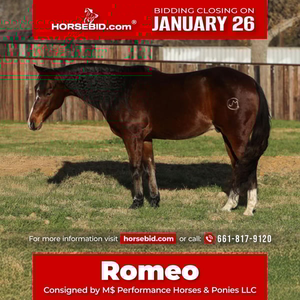𝐉𝐀𝐍𝐔𝐀𝐑𝐘 ⭐️𝑨𝒍𝒍 𝑺𝒕𝒂𝒓 𝑳𝒊𝒏𝒆𝒖𝒑⭐️ Happening now thru MONDAY | JANUARY 26th - Available EXCLUSIVELY on HorseBid's website! For more details and to register visit: www.Horsebid.com CONSIGNOR CONTACT: M$ Performance Horses & Ponies LLC 661-817-9120 LOCATION: Stephenville,TX BREED: Friesian quarter horse cross REGISTERED: No REGISTERED NAME: Romeo COLOR: Bay HEIGHT: 14.2 AGE: 12 GENDER: Gelding Romeo is a 12-year-old Friesian/Quarter Horse cross standing 14.2 hands, and he’s the kind of horse that makes you fall in love the moment you swing a leg over. He is kind, honest, steady, and incredibly willing, the type that takes care of his rider every single ride. He comfortably rides English and Western and is as versatile as they come. Romeo loves to hack around the cross-country course, cruises quietly down the trail, and confidently crosses water, logs, bridges, and tarps without hesitation. He has traveled many miles on busy city trails all across Texas and takes traffic, crowds, and loud noises completely in stride. From trail rides to the Fort Worth Stockyards, Romeo handles it all with calm confidence and class. In Western tack, he is absolutely stunning with his long, thick mane and tail and is beautifully fancy broke. He neck reins effortlessly, moves softly off your leg, has a pretty spin both directions, and a solid stop. His buttery-smooth walk, trot, and rocking-chair lope make every ride enjoyable. Romeo is truly for everyone — from small cowboys and cowgirls to adult riders of any age. He has safely packed beginners through advanced riders, and he’s the kind you can hop on bareback in a halter and wander off into the sunset. He is SAFE, GENTLE, EASY, and FUN, the horse you look forward to riding every single day. This is the kind of horse you can climb on in the coldest January mornings or the hottest August afternoons, knowing he will be the same trustworthy, kind soul every time. No drama. No surprises. Just a horse that stays true, honest, and dependable. Romeo isn’t just a horse — he’s a partner, a confidence builder, and a best friend. Horses like him are incredibly rare, and once you meet him, you’ll understand why he’s so hard to forget. He is UTD on farrier, teeth and vaccinations. We are open to anyone interested in him to schedule a time to come see him or if you can’t make it schedule a FaceTime showing to see him. If you need help with transport don’t hesitate to ask we have a list of reputable haulers that can get him safely to your doorstep WORLD WIDE including, Alaska , Mexico, Hawaii, Canada and anywhere in between.
