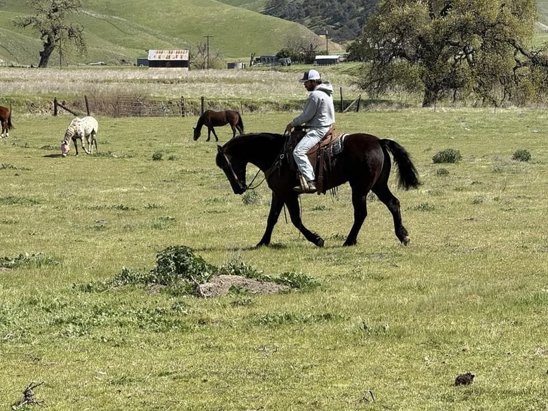 ONLINE AUCTION Place your bids at www.PlatinumEquineAuction.com Starting Bid $3500 Auction ends April 20th, 2025 Need a new saddle? Check out White Rock Saddles on our website or Facebook! Blackjack – The Ultimate Gentlemen, you don’t see many like him. He’s an 11-year-old Friesian quarter cross standing at a solid 15 hands. This guy is the perfect mix of finesse and gentleness, and let me tell you, he’s the most laid-back dude you could ever meet. You can throw anything at him, and he won’t even blink! He’s an absolute dream to ride, super easygoing, and perfect for anyone, whether you’re a newbie or a seasoned rider. He carries himself beautifully and moves like a pro. He picks up all his leads effortlessly and has a smooth-as-glass ride. Plus, he’s got a nice stop and backs up like a champ. Riding him is just a pleasure! He rides collected and has the perfect one hand neck rein. Blackjack’s done everything from cattle work to trail obstacles. He’s seen it all: bridges, flags, tires, tarps – you name it! On the trail, he’s got this calm easy going vibe that makes him shine. No surprises for this guy; he’s tackled all kinds of terrain, wildlife, downed trees, and thick brush like a pro. If you’re looking for a horse that anyone can ride, Blackjack is your guy. You can ride him bareback in halter and crawl all over him he’s a saint. He’s even been down busy streets with cars zooming by, and he just strolls along like it’s no big deal. He ties, clips, and bathes like a champ, and he just loves hanging out with his humans. He loads and hauls well, is great for the farrier, and comes right to you when you call. Honestly, if you’re in the market for a safe, trustworthy, and all-around gentleman of a horse, you’ve got to check out Blackjack. If you want more info, contact Dina at Longhorn Ranch at 831-537-1915. We are located in Paicines, CA. ONLINE AUCTION Place your bids at www.PlatinumEquineAuction.com Starting Bid $3500 Auction ends April 20th, 2025 Need a new saddle? Check out White Rock Saddles on our website or Facebook!