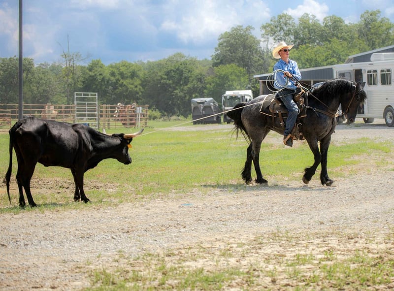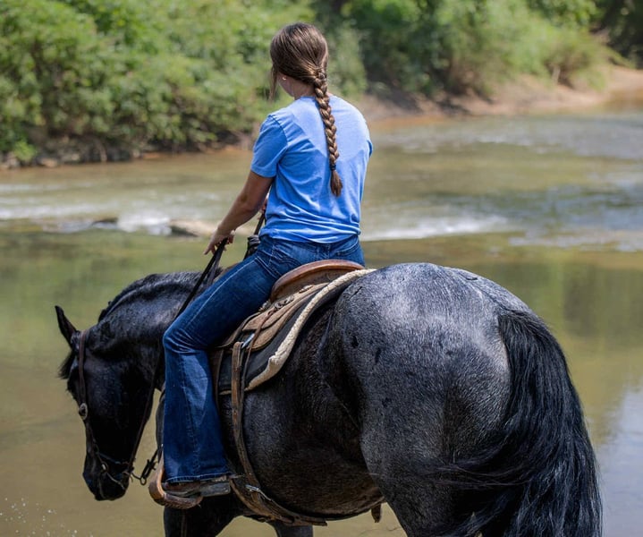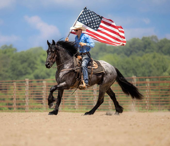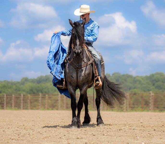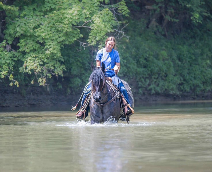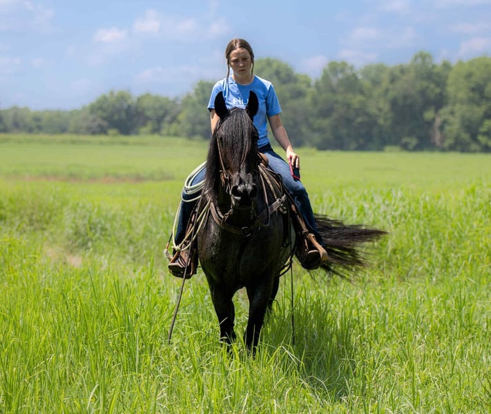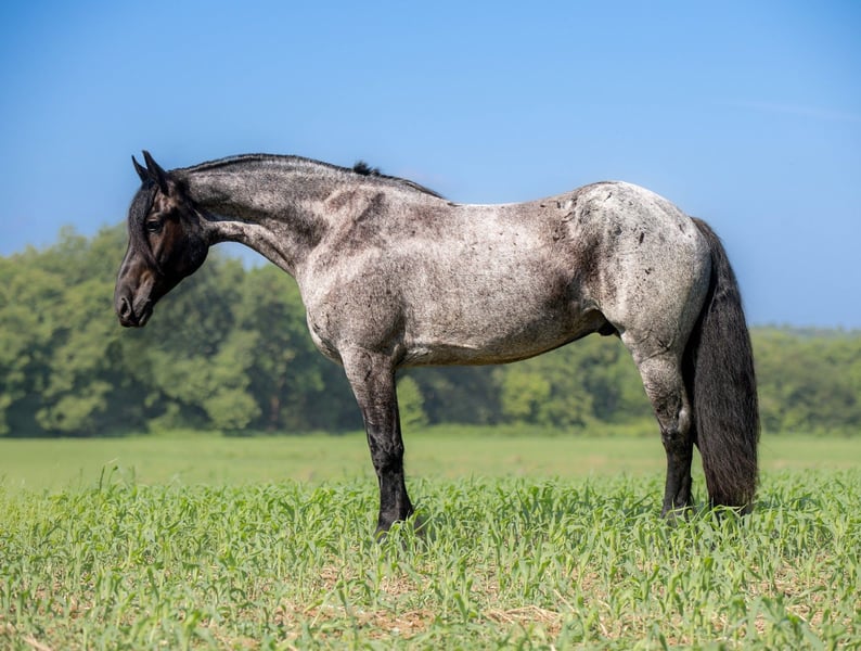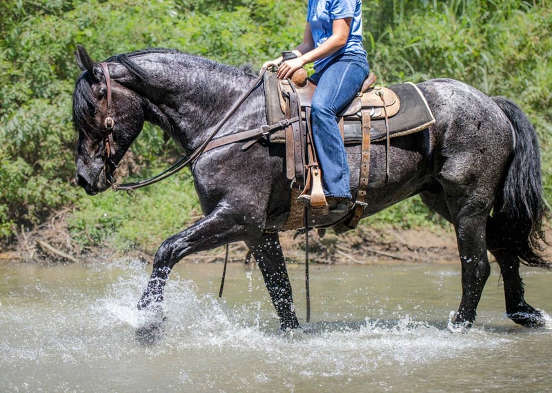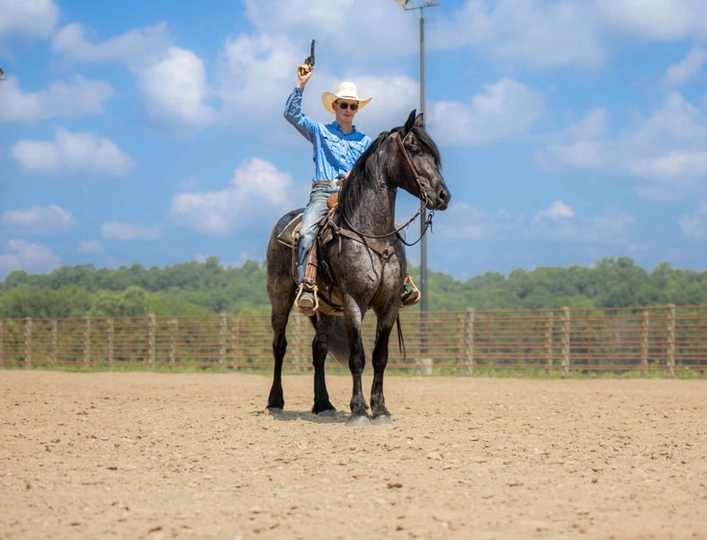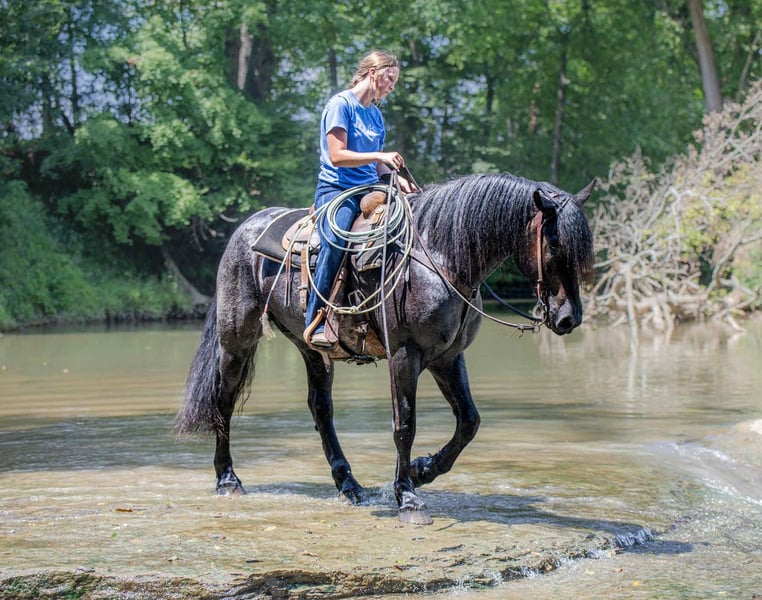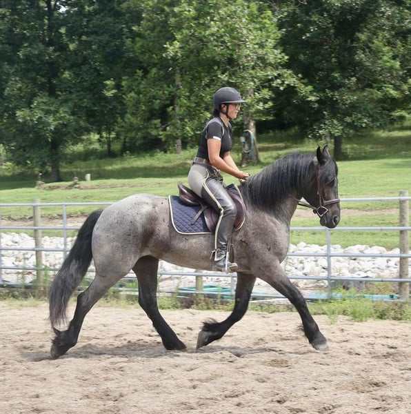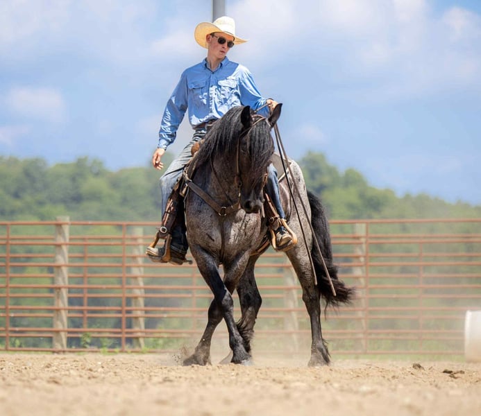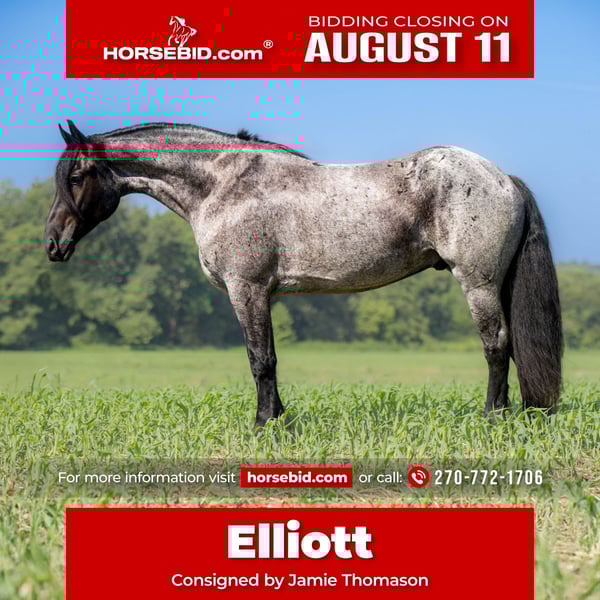 ⚜ The HERITAGE Classic ⚜ Happening now thru MONDAY | AUGUST 11th - Available EXCLUSIVELY on HorseBid's website! For more details and to register visit: www.Horsebid.com CONSIGNOR CONTACT: Jamie Thomason 270-772-1706 LOCATION: Auburn, KY BREED: Friesian/Percheron Cross REGISTERED: No REGISTERED NAME: ELLIOTT COLOR: Blue Roan HEIGHT: 15.3 AGE: 4 GENDER: Gelding Elliott is 4 yr old, Friesian/Percheron cross gelding, standing a solid 15.3 hands, boasting a rare and eye-catching blue roan coat. A beautiful mover with a fluid, ground-covering stride, he shines both under saddle and in harness. Exceptionally versatile, he’s been ridden English and Western, worked cattle on the farm, & explored miles on the trail. He’s willing, steady, and adaptable making him a standout partner for a wide range of disciplines. Elliott takes to the trail like a seasoned veteran. Crosses water, bridges, downfall, & carefully navigates various terrain. An enjoyable mount that rides out alone or in a group. In town, we’ve rode him right down Main Street. He is unbothered by passing traffic and is always up for a meet and great….someone is always asking to pet him or to take a picture. Elliot has great natural self carriage, an expressive airy trot, a rhythmic uphill canter, & smooth transitions. He canters both directions on the correct lead, moves laterally, easily controlled by feet and seat, & has been very willing taking him over cross rails at home. He shows the potential for dressage or low level eventing. Elliott enjoys the pampered life, but he isn’t afraid of a days work. He’ll push cattle, open & close gates, and pays no mind to roping strays. Elliott is also trained to drive. He is a gentleman behind the lines & traffic safe. Has even been driven to church by the kids. Elliott has undergone desensitization training. He is unbothered by tarps, is gun safe, & carries the flag. Elliott is perfectly content in a stall or can live outside. He turns out in a mixed heard, zero issues. He is always easy to catch, easy to load & haul, enjoys people, loves his baths, and is a pleasure to have in the barn. He has great, black feet, and is currently barefoot. Elliott is an exceptional, versatile gelding, truly a fun ride, awaiting his next partner. The foundation to advance in a specific discipline, as well as, the experience to be someone’s main trail companion. Buy with confidence! Elliott has a recent wellness/soundness exam with flexions, no issues! He is current on all cares, vaccinations, and comes with all documentation required for transport. If you have any further questions or would like to meet Elliott prior to adding him to your family, feel free to reach out!