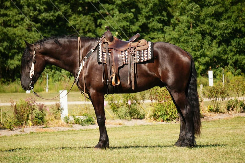 🍂 𝓐𝓾𝓽𝓾𝓶𝓷 𝑨𝑳𝑳 𝑺𝑻𝑨𝑹 𝑳𝑰𝑵𝑬𝑼𝑷 🍂 Happening now thru MONDAY | OCTOBER 6th - Available EXCLUSIVELY on HorseBid's website! For more details and to register visit: www.Horsebid.com CONSIGNOR CONTACT: MW Equine Stables LLC 330-365-0233 LOCATION: Fresno, OH BREED: Friesian/Percheron Cross REGISTERED: No COLOR: Black HEIGHT: 17.2 AGE: 5 GENDER: Gelding 🤩Take a Look at Diego …. You will not find another one like him‼️ Diego is a 5 year-old 50% Friesian 50% Percheron cross gelding. He stands around 17.2 hands. If beauty and elegance are what you’re looking for, then Diego is your guy! He has all the beautiful Friesian characteristics. Diego will do anything you ask of him. This is once in a lifetime Opportunity. Not every day do they come along like Diego ! He is quiet, calm, and collective. With his rocking chair canter, and his beautiful, elegant trot, Diego will have everyone noticing you! He is broke to ride and drive the very best . He crosses bridges, walk through the deepest waters, and will jump over the logs . He rides Western, English, bridal-less and drives. Diego also knows a few tricks, like lay down and sit.. He is a complete gentleman to be around whether being handled on the ground or under saddle. Diego makes beautiful, smooth, lead departures, great transitions, takes his lead correctly every time, and is very willing to work for you. He has been exposed to everything on the trails, making him even more prepared for the excitement that happens outside of the Arena. Diego stands crosstied , and patiently waits while bathing and being groomed , and tacked up, and bridal. While riding through town, you can take him anywhere! Down, busy, sidewalks, and streets, through parking lots of vehicles and pedestrians, across bridges, and he will have the same ride every time. On the trails, Diego will keep his rider safe. Gracefully stepping over logs, through creeks, and all kinds of obstacles you might encounter. When going for a carriage ride, Diego is easy to harness and hitch. He is trained, single and double. He will take you down busy highways, Streets , and make you feel like an absolute Rockstar . He looks stunning under harness and has enough style to stand out on the big city streets. If you’re searching for your next all around prospect ,carriage horse, family horse, or trail horse… ☑️Diego checks every box! It is a big world and the opportunities for large gelding are very rare. If you’re in the market for your forever horse, here he is! ☎️ FMI Contact Marcus @ 330-365-0233 Located in Fresno, Ohio …… Nationwide Shipping Available ‼️Feel Free to schedule a ride with Diego at our farm ‼️