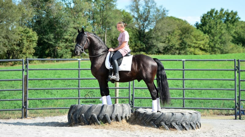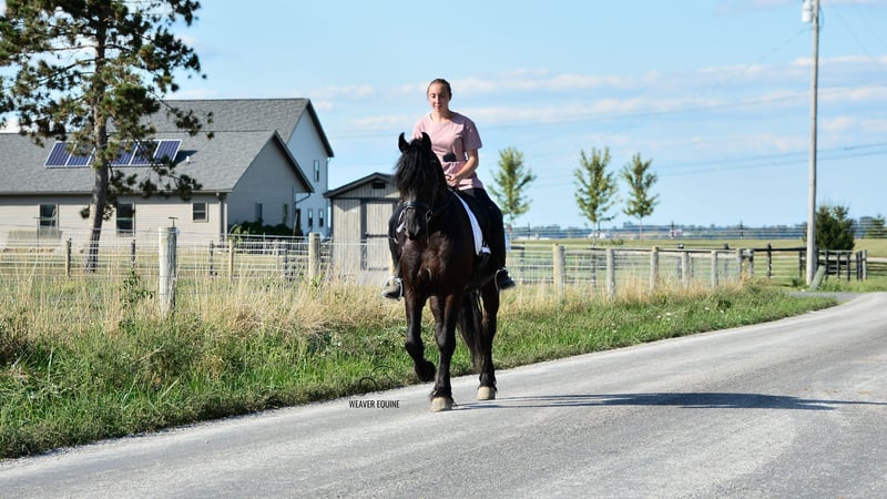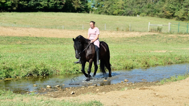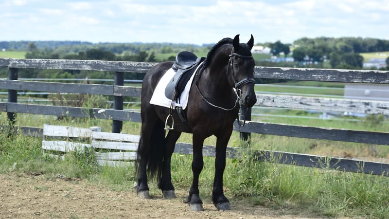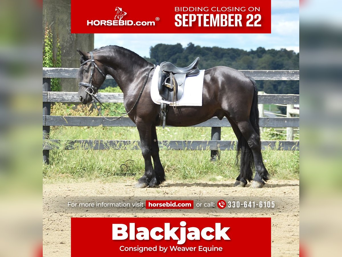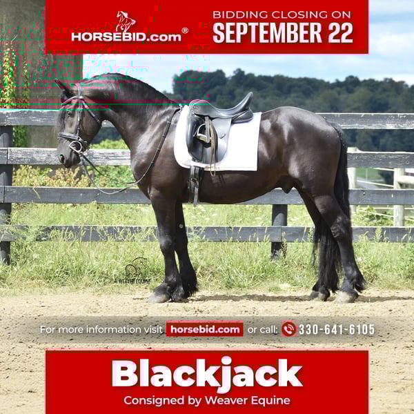 🍁𝒕𝒉𝒆 𝐅𝐀𝐋𝐋 𝑺𝒑𝒆𝒄𝒕𝒂𝒄𝒖𝒍𝒂𝒓🍁 Happening now thru MONDAY | SEPTEMBER 22nd - Available EXCLUSIVELY on HorseBid's website! For more details and to register visit: www.Horsebid.com CONSIGNOR CONTACT: Weaver Equine 330-641-6105 LOCATION: Fredericksburg, OH BREED: Fresian/Morgan REGISTERED: No COLOR: Black HEIGHT: 15.1 AGE: 5 GENDER: Gelding Beautiful 5yr old Friesian Cross gelding. Well broke to ride and drive. Rides both English and western disciplines. Amazing arena horse! Lopes a circle nicely. Picks up walk, trot, canter easily. Leg yields. Does great on obstacle courses. Stands well to mount. Stands nicely at a mounting block. Stops and stands when asked. Picks up both leads correctly. Blackjack would make a super nice dressage/eventing horse. Blackjack has also been used out and about. He has been on trails. He will cross creeks and step Over logs with ease. He does fine When out in groups. He conquers the hills easily as well. He has also been used out on the roads, in the carriage and under saddle. He will stop and stand well at stop signs. This pretty gelding also has amazing ground manners and has the sweetest personality. He is easy to catch in the stall. Ties well on a lead line, in the Crossties and ground ties as well. He is easy to handle as well. He will stand well to groom, tack, for the farrier etc. He will pick his feet nicely. Does Fine with fly Spray. Trailer loads well. He has a super sweet attitude and loves attention! 100% sound.