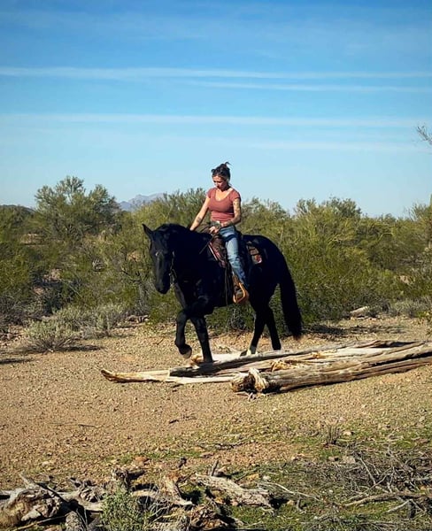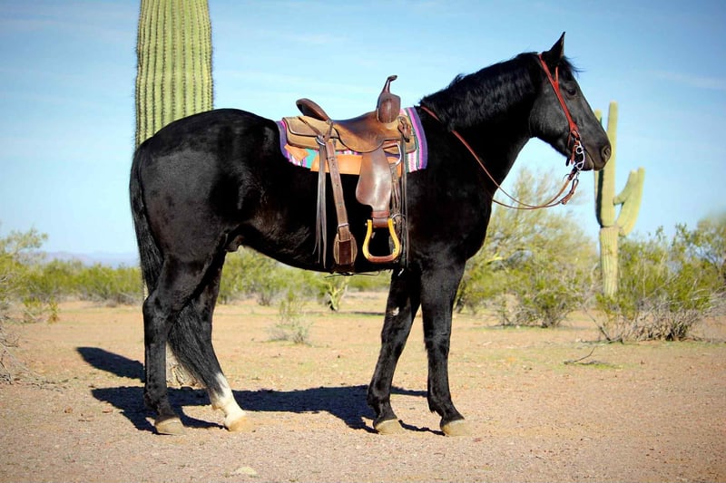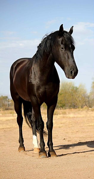 ONLINE AUCTION Place your bids at www.PlatinumEquineAuction.com Starting Bid $3500 Auction ends January 4th, 2025 Need a new saddle? Check out White Rock Saddles on our website or Facebook Beauty, brains and versatility… Odie has it all! This sweet gelding is a 6 year old Friesian QH cross gelding standing a stout 15.1 hands tall. He has a stunning jet black coat and turns heads everywhere he goes. Odie is the type of horse that wants to be your best friend, he has an in your pocket personality and loves getting attention and being loved on. He’ll be the first one to greet you at the gate! Odie has done a little of everything. He has roped and dragged the dummy, pushed cattle, given riding lessons, trail rides and even started riding English. He also rides bareback and is very comfortable with his smooth gaits. Out on the trails Odie is confident and happy to go wherever he is pointed. He will cross brush and logs, go up and down the washes and is also comfortable on the streets as well. He has been ridden out alone as well as in groups. He is not a barn or buddy sour horse at all. Odie is gentle and safe, taking care of his rider in all environments. He has been exposed to tractors, dogs, traffic, and all the crazy things that come with small children such as bikes and mini four wheelers being driven through the barn aisle. On the ground Odie has great ground manners. He stands tied quietly, loves baths, good for the vet and farrier and loads and hauls nicely. He has no vices and is an easy keeper and requires no maintenance. Odie is ready to find his own adventure partner and best friend, he will give you 100% of his heart each and every day! Please feel free to call or text Claire Siebols at 435-899-0508 with any questions about this sweet boy! He is located in Marana, Arizona and we are also happy to help arrange transport anywhere needed! ONLINE AUCTION Place your bids at www.PlatinumEquineAuction.com Starting Bid $3500 Auction ends January 4th, 2025 Need a new saddle? Check out White Rock Saddles on our website or Facebook