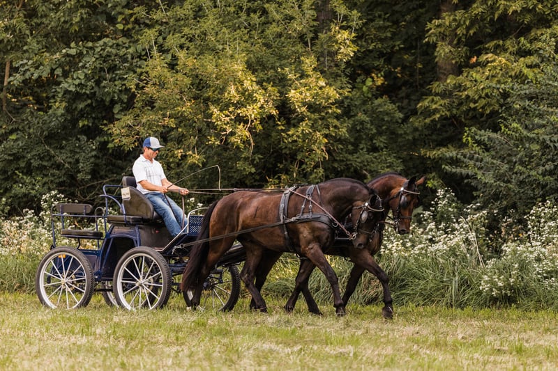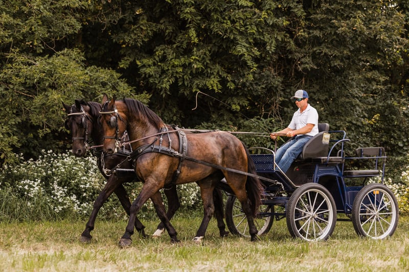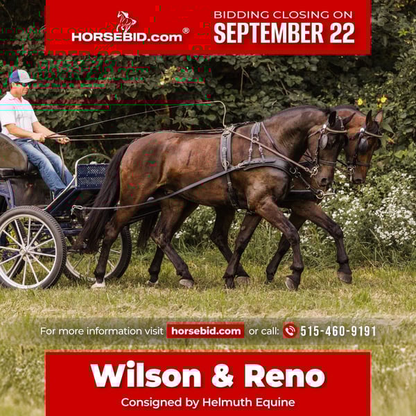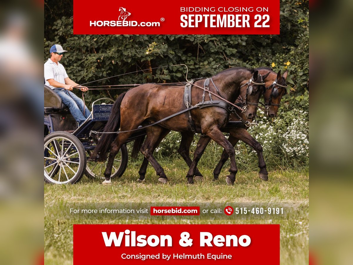 🍁𝒕𝒉𝒆 𝐅𝐀𝐋𝐋 𝑺𝒑𝒆𝒄𝒕𝒂𝒄𝒖𝒍𝒂𝒓🍁 Happening now thru MONDAY | SEPTEMBER 22nd - Available EXCLUSIVELY on HorseBid's website! For more details and to register visit: www.Horsebid.com CONSIGNOR CONTACT: Helmuth Equine 515-460-9191 LOCATION: Ames, IA BREED: Friesian X Standardbred REGISTERED: No COLOR: Bay HEIGHT: 16 (Wilson) & 15.3 (Reno) AGE: 5 GENDER: Gelding Meet Wilson & Reno, a very unique and rare pair of 5 year old Friesian X geldings. They are very well trained to both ride and drive. They can work in any setting whether it’s mowing hay in the field, working in the arena, or pulling the carriage to town on a Sunday afternoon. They do it all with ease. Both ride very well and have been on many trail rides. They go Western, English, and even bareback. Wilson has competed in several dressage shows and scored very well. He has also done show jumping and cross country jumping. Reno is also a very fancy mover and would also make a great dressage horse. They both drive single with confidence and have even been used to hook with young horses to teach them to drive. When paired together, they are like two peas in a pod. If you’re looking for a pair to compete in combined driving, they are super easygoing, uncomplicated in the bridle, and make for a very enjoyable pair. On the trail, both horses will follow or lead and will willingly go anywhere you point them. They get along well in the pasture, are easygoing in and around the barn, stand quietly for the farrier, stand in the wash rack, and are easy to tack and untack. They are both true gentlemen in every way, with excellent work ethics and sensible minds. If you’re looking for a pair of horses that can meet any need you’ve ever dreamed of, Wilson and Reno will fulfill those dreams.