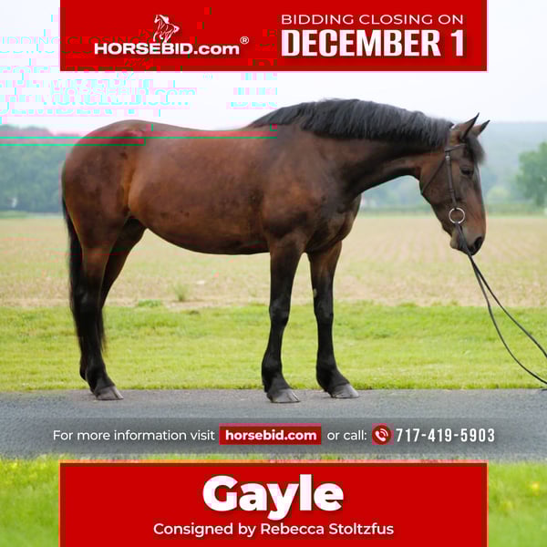 ⚜️ 𝓽𝓱𝓮 𝐇𝐨𝐫𝐬𝐞𝐦𝐚𝐧'𝐬 𝓢𝓱𝓸𝔀𝓬𝓪𝓼𝓮⚜️ Happening now thru MONDAY | DECEMBER 1st - Available EXCLUSIVELY on HorseBid's website! For more details and to register visit: www.Horsebid.com CONSIGNOR CONTACT: Rebecca Stoltzfus 717-419-5903 LOCATION: New Holland, PA BREED: Friesian Sport Horse REGISTERED: No COLOR: Dark bay HEIGHT: 16 AGE: 5 GENDER: Mare 🌟 Gayle 🌟 5 year old, 16h, Friesian Sporthorse mare. In a nutshell, Gayle is the perfect example gentle giant. She loves to be cuddled and scratched, comes up to you in the field, and stands to be groomed, bathed, tacked, handles well for the vet and farrier, and super patient and calm around dogs and kids. Under saddle, Gayle has a safe, solid, walk, trot and canter. She is a soft and responsive and has 3 comfy gaits. Imagine riding a big couch! Gayle rocks the trails, and handles ditches, bank, logs, and water with ease. Goes quietly alone or in a group, and overall has more whoa than go. She is smart and athletic and catches on to new things easily. Pops over small cross rails and logs with the potential to do more! Gayle has been trailered and ridden off property multiple times and handled everything like a pro! Gayle is ready to be the perfect all around family horse, or an amazing best partner for a young rider looking to go places on a solid, athletic mount! I could also see her doing really well in a lesson or therapy program. Gayle is a very easy keeper, with no maintenance. No vices, bad habits, etc. Up to date on deworming, feet, teeth, and vaccinations. Has a current coggins. Trial rides welcome. PPE’s welcome at buyers expense. If you think Gayle would be a good fit for your family or if you would like to come meet her, reach out to Rebecca 📲 717.419.5903