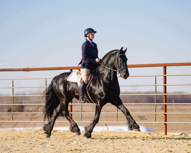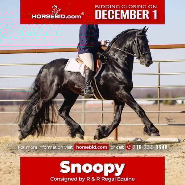 ⚜️ 𝓽𝓱𝓮 𝐇𝐨𝐫𝐬𝐞𝐦𝐚𝐧'𝐬 𝓢𝓱𝓸𝔀𝓬𝓪𝓼𝓮⚜️ Happening now thru MONDAY | DECEMBER 1st - Available EXCLUSIVELY on HorseBid's website! For more details and to register visit: www.Horsebid.com CONSIGNOR CONTACT: R & R Regal Equine 319-334-8649 LOCATION: Independence iowa BREED: Friesian REGISTERED: Yes REGISTERED NAME: Ivan P COLOR: Black HEIGHT: 15.3 AGE: 7 GENDER: Gelding ✨ Snoopy – Exceptional 7-Year-Old Registered Friesian Gelding ✨ Age: 7 years Height: 15.3 hands Color: Black Breed: Purebred Friesian (registered) Sex: Gelding Snoopy is a striking and beautifully built purebred Friesian gelding who turns heads everywhere he goes. At 7 years old and standing a well-balanced 15.3 hands, he offers the perfect combination of presence, athletic ability, and level-headed maturity. With his classic Friesian look—jet-black coat, expressive eyes, and elegant movement—he makes an unforgettable impression both under saddle and in harness. Snoopy is wonderfully versatile in his training. He goes both English and Western, and he transitions easily between the two disciplines. Under saddle, he is responsive, willing, and comfortable to ride, making him suitable for a variety of riders who appreciate a horse with good training and a calm demeanor. He has been thoughtfully brought along, giving him a solid foundation and a soft, honest way of going. In addition to his riding abilities, Snoopy is fully trained to drive, making him a standout for those who enjoy driving horses for pleasure, parades, or special events. He has participated in multiple Christmas rides, birthday celebrations, and community events, always handling the excitement, noise, and crowds with confidence. His experience in public settings shows his reliable nature and makes him an ideal candidate for continued use in parades, carriage rides, or other festive occasions. Snoopy’s temperament is exactly what you hope for in a Friesian: kind, intelligent, and eager to please. He enjoys attention and forms strong bonds with the people who work with him. His combination of training, exposure, and natural talent makes him an exceptional partner for someone seeking a horse that can do a little bit of everything—whether riding for pleasure, driving for fun, or stepping into more formal disciplines. If you're looking for a beautifully trained, people-oriented, and impressively versatile registered Friesian gelding, Snoopy is truly one of a kind and ready for his next loving home.