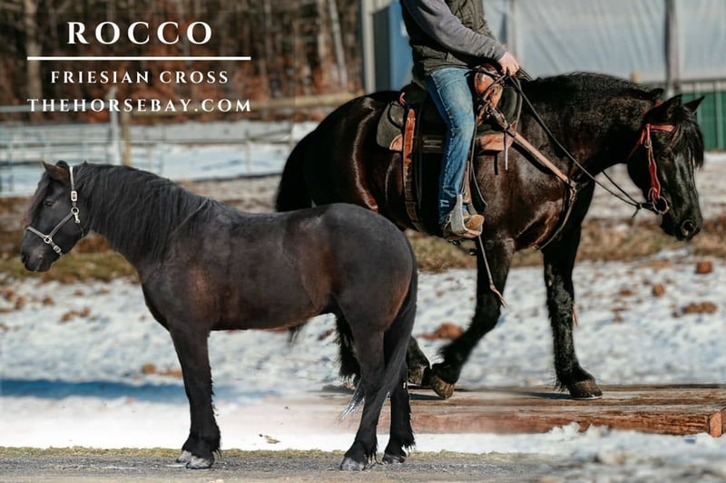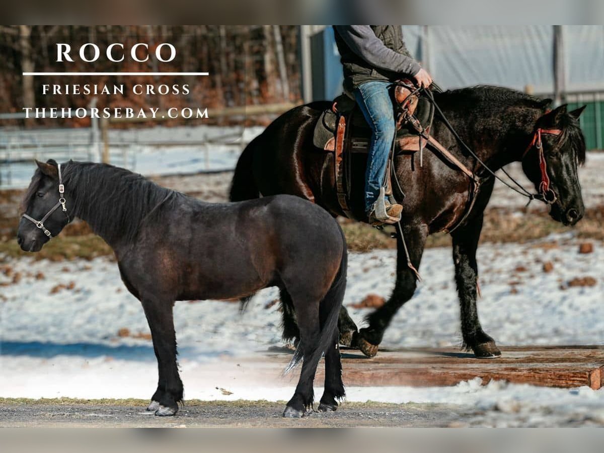 “Rocco” is a 6-year-old, 16-hand Friesian cross gelding. He is the first one to meet you at the gate and loves to be right in your pocket. He is a great size to fit many different riders. Rocco will side pass over to you at the mounting block and wait patiently for you to get on. He is not fazed by tarps, the bullwhip, flags or anything else we throw his way. He has been ridden English, Western & bareback. He is quiet and enjoyable to ride. Complete beginners to advanced riders have ridden him on the trails and in the arena. He loves the trails! Water, rocky terrain, steep hills, and bridges, nothing will bother this horse. Rocco will confidently ride down a busy road, unfazed by the surrounding traffic. He knows his leads and has an excellent whoa. Rocco will also drive. He has been hooked in the carriage and on the sleigh. He will stand patiently while being hitched up, and when you are getting in and out of the carriage! Rocco is always eager to work and please his owner. He has a puppy dog personality and gets along with mares and geldings in the pasture. He stands for the vet, farrier, or just to be loved on and groomed. He has been hauled off the property many times and is the same on the property as he is off. He sells 100% sound with no vices. PPE is welcome at the buyer’s expense. Contact Dayton for more information! We are located in Warsaw, NY!