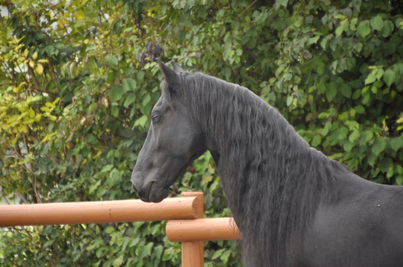 Un frisón muy moderno y deportivo de los Países Bajos con movimientos excelentes. Tiene un buen espacio de movimiento, una parte trasera fuerte y una actitud de trabajo fantástica. Además, está correctamente construido y tiene una larga melena. En el trabajo, ya sea en el círculo o delante del carro (ha sido conducido con 2, 3 o 4 caballos), siempre trabaja bien, muestra una actitud diligente y realmente disfruta de su trabajo. Quien busque un frisón con aspiraciones deportivas, ha llegado al lugar correcto. Tiene un carácter increíblemente dulce y tranquilo y haría cualquier cosa por su jinete. Un frisón que disfruta trabajando y que siempre quiere hacer todo bien. Es muy dispuesto a rendir, pero siempre controlable. Le encantan los paseos relajados, ya sea solo o en grupo. También aquí siempre se mantiene controlado. Por favor, las consultas únicamente por teléfono.