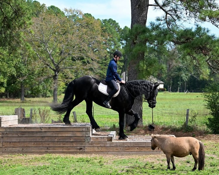 What a stunner! Marco is a 7-year-old black Friesian gelding standing a proud 17— and he’s every bit as sweet as he is striking. Marco isn’t your typical Friesian! This handsome boy is a total teddy bear, always the first to greet you in the barn and soak up every bit of attention. Under saddle, he’s a true gentleman — kind, willing, and ready to impress. ✔️ Schooling Level 1 Dressage – elegant, uphill, and naturally balanced✔️ Confident through obstacles, water, and trail work✔️ Loves bareback rides and attention in the barn✔️ Safe, easy to handle, and a joy to be around Marco has breezed through our program with flying colors and is ready to take his next partner far — whether that’s continuing in dressage, pleasure riding, or even driving. This exceptional gelding has all the talent, temperament, and presence to be a true star. ✨ Don’t miss your chance to make Marco part of your family! 📩 PM us for more information.