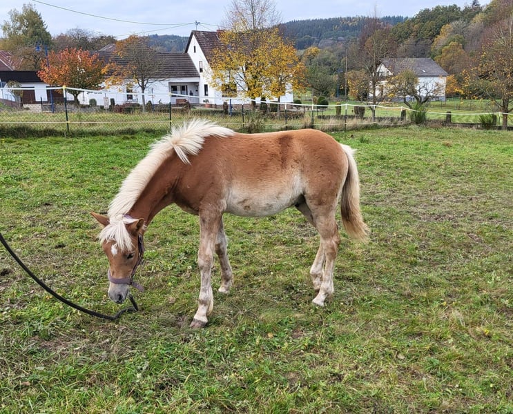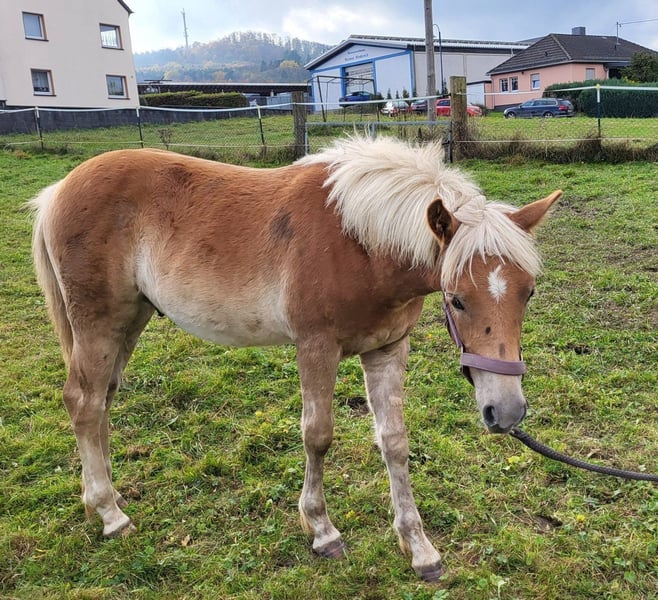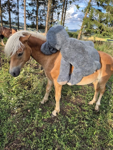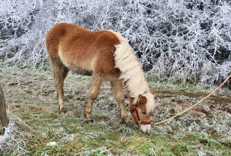 Pepino – our little charmer and cuddle king has been with us since October, will turn one year old in March, and has learned a lot since he moved from the mountain pasture. He walks nicely on the halter and has integrated well into the herd. Not as bold as his buddy Sofus, he likes to hide behind him when situations get too scary. He has also learned to watch the older horses and see how they behave. That's why he now greets the tractor with joy when it brings fresh hay and already knows all the vehicles that deliver his food. He stands calmly for the vet, takes deworming treatments without a halter, and offers his front hooves without being held, but he is not too keen on having his hind legs touched, so a bit of patience is needed to convince him. But we are sure he will manage that soon without any issues. The farrier still finds him very well-behaved. He is already familiar with dogs, chickens, and ducks, as well as everything else that roams in the forest. Has Pepino piqued your interest? Then get in touch, and the charmer can soon wrap you around his little finger too.