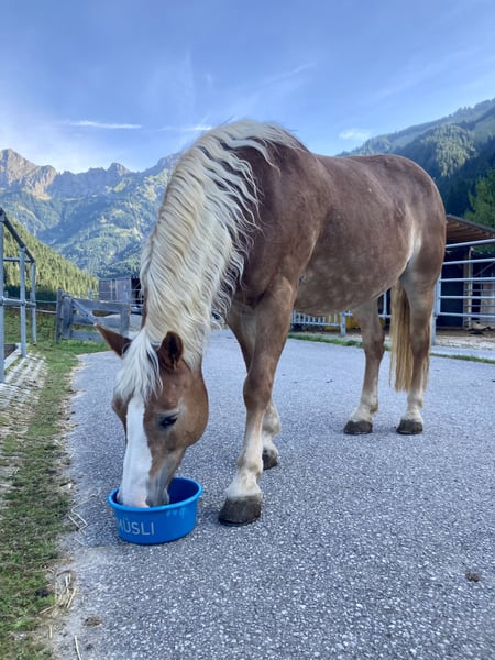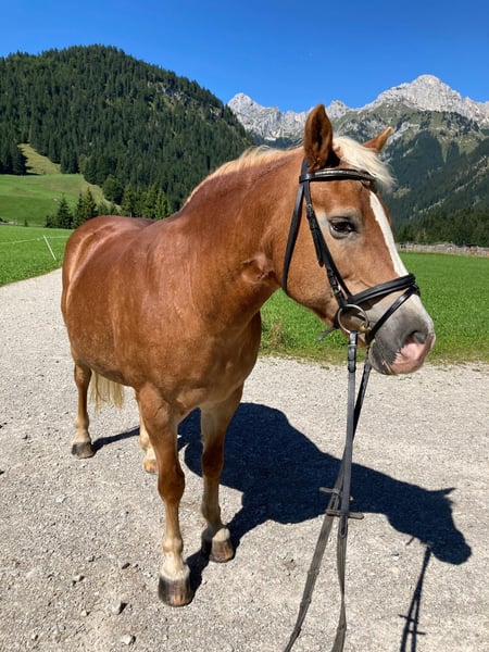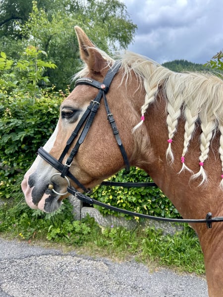 Aufgrund von Bestandsverkleinerung suchen wir für unsere Haflingerstute Adriana ein neues, liebevolles Zuhause. Adriana ist im Umgang ein Schatz: sie passt immer auf die Kinder auf, die sie führen, sie steht brav am Anbindeplatz und genießt ausgiebige Putzeinheiten sehr. Sie ist auch mit kleinen Kindern sehr geduldig beim Hufe auskratzen und lässt sich mit Wasser abspritzen, mit Mähnen-/Fliegenspray einsprühen sowie auch einflechten. Aktuell wird sie bei uns noch von Anfängern an der Longe geritten, im Gruppenunterricht führt sie die Abteilung gerne an. Sie lässt sich im Gelände brav mit Kindern führen, ist jedoch auch immer noch mit genügend Go ausgestattet - daher ist sie nicht von Kindern im Gelände ohne "Führperson" zu reiten. Dennoch zeigt sie grundsätzlich keine Unarten, weder beim Reiten noch beim Führen oder Longieren. Wir wünschen uns für Adriana einen Platz bei einer Familie, die dieses brave Kleinpferd als gemeinsamen Lehrpartner aber auch als Familienmitglied zu schätzen weiß. Adriana hat unzähligen Kindern das Reiten beigebracht und soll nun die Aufmerksamkeit erhalten, die sie als Rentnerin verdient hat. Aufgrund ihres Alters wird sie bei uns nur noch von leichten Kindern geritten und nicht häufiger als drei oder vier Mal die Woche eingesetzt. Wir würden uns wünschen, dass Adrianas neue Familie hier auch mit Verstand und Herz auf sie schaut und ihre körperlichen Belangen aufgrund ihres Alters wahrnimmt und sie dementsprechend bewegt. Wir geben Adriana in liebevolle Hände ab, Platz definitiv vor Preis. Sie wird mit einem Schutzvertrag verkauft, da wir ausschließen möchten, dass sie teurer weiterverkauft wird, zum Schlachter kommt oder aufgrund ihrer Gutmütigkeit in einer anderen Reitschule weiter "arbeiten" muss. Adriana möchte nicht mehr in einer Herde stehen, das stresst sie mittlerweile sehr. Bei uns hat sie ihre eigene Box und steht tagsüber mit Kontakt zu anderen Pferden auf dem Paddock. Wichtig: Adriana hatte vor vielen Jahren einen Hufreheschub und wird bei uns streng diätisch gehalten - daher ist dies auch nie wieder vorgekommen. Sie knabbert bei uns unter dem Zaun hindurch am Gras und erhält auch hier und da einen Apfel oder eine Karotte - das verträgt sie gut. Dennoch möchten wir sie nicht in eine Haltungsform mit Koppelgang vermitteln. Zudem hat ein Blutbild vor zwei Jahren ergeben, dass sie Cushing hat. Sie erhält täglich eine halbe Tablette Prascend und kommt damit super zurecht. Die Kosten liegen ungefähr bei 40€ pro Monat. Bei ernsthaftem Interesse freuen wir uns über eine Nachricht mit kurzer Vorstellung ihres neuen Zuhauses.