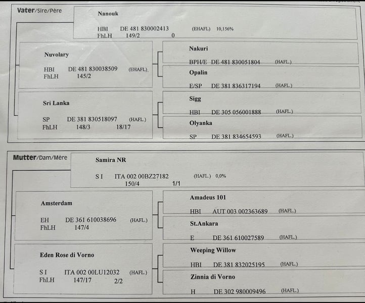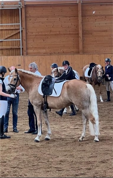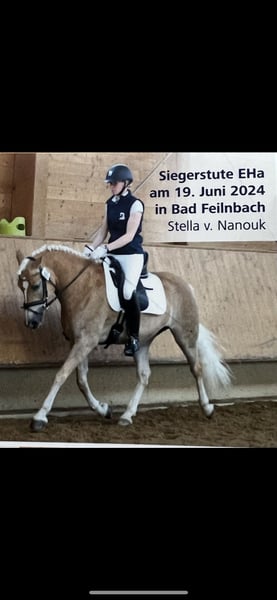 Stella ist eine 7jährige Edelbluthaflinger Stute , die besonders durch ihr freundliches und arbeitswilliges Wesen auffällt und bereits als Fohlen mit ihrer Typbrillanz ein Ticket zum Bayrischen Fohlenchampionat 2018 in München lösen konnte. Außerdem erhielt sie mit einer Eintragungsnote von 7,57 die Zulassung zur Landesschau 2024. Parallel wurde sie angeritten und konnte ihre Stutenleistungsprüfung mit 8,23 als Siegerstute ablegen. Stella hat schon hervorragende Fohlen zur Welt gebracht, ihr erstes Hengstfohlen wird dieses Jahr im November auf der Süddeutschen Körung vorgestellt. Aktuell hat sie ein tolles Stutfohlen bei Fuß. Stella ist kein Kinder-/Anfängerpferd! Sie benötigt jemanden der gut durchgreifen kann und sie sportlich fördert. Im täglichen Umgang zeigt sie sich gegenüber dem Menschen immer aufgeschlossen und freundlich, ist unproblematisch im Herdenverband, da auch in Solchem aufgewachsen. Hängerfahren, waschen Oder Hufschmied etc. ist alles kein Problem für sie. Stella wurde regelmäßig entwurmt und ist Tetanus,Herpes und Influenza geimpft. Ihr Stockmaß ist ca 149cm. Bei Interesse können Sie Stella jeder Zeit besuchen. Gerne senden wir vorab weitere Informationen sowie ein Video.