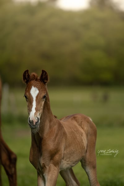 Sky-Dweller ist ein bezauberndes Hengstfohlen, geboren am 26.04.2025, der mit seinem Charme und seinem Potenzial begeistert. Auf den Fotos ist er gerade mal 5 Tage alt. Er präsentiert sich in einem schönen Fuchs-Farbton, der sich mit der Zeit zu einem eleganten Dunkelfuchs entwickeln wird. Besonders auffällig ist die schöne Blesse, die ihm ein einzigartiges Aussehen verleiht. Auf der Fohlenschau in Luhmühlen wurde das junge Talent mit 8,5 für Typ und 7,5 für den Rest bewertet. Er hat alle Herausforderungen souverän gemeistert, zeigt sich brav auf dem Anhänger, ist im Umgang äußerst lieb, verschmust und freundlich - ganz wie seine Mutter. Die Kulisse, das Publikum aber auch das Warten auf dem Anhänger war für das Fohlen überhaupt kein Problem. Das Fohlen wächst gemeinsam mit seiner Mutter in einer harmonischen Herde von fünf Stuten mit Nachwuchs auf, was ihm eine natürliche und soziale Umgebung bietet. Über den Mutterstamm: Fajana ist eine 2011 geborene Dunkelfuchsstute aus Fürst Nymphenburg × Liseth (aus Londonderry). Sie ist eine Staatsprämienstute aus der Zucht von Hans-Henning von der Decken. 2014 hat sie die Leistungsprüfung gemacht. Ihre sehr guten Grundgangarten sind schwungvoll und ausdrucksstark. Wertnote Rittigkeit Richter: 8,0 Wertnote Rittigkeit Fremdreiter: 9,5 Sie war siegreich in Dressurprüfungen der Klasse A. Stockmaß 168cm Auf den Bildern ist das Hengstfohlen 5 Tage alt. Ein Foto ist dabei von der Fohlenschau am 13.06.2025 in Luhmühlen.