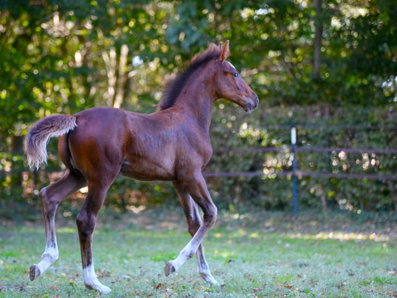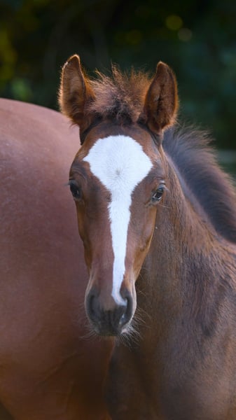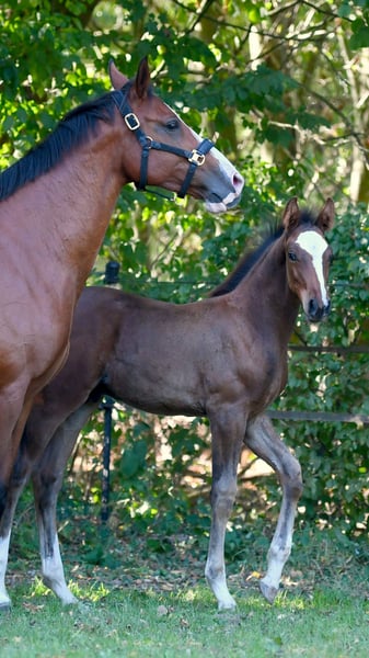 Nuestro Eddie es una verdadera potencia con una increíble cantidad de energía. De gran tamaño y con una base correcta, esperamos que alcance una altura final de aproximadamente 1,72 m. Con cuatro patas blancas y una gran estrella, seguramente será un atractivo. Sus hermanos mayores ya están teniendo éxito en el deporte: - Hermana de padre (hija de Diamant de Semilly) con 6 años ha competido internacionalmente en 1,35 m y ha sido colocada en saltos para caballos con notas de hasta 8,9. - Hermano de sangre (nacido en 2022) ha sido aprobado en Oldenburg. - Hermano de sangre (nacido en 2020) con 5 años ha sido colocado 13 veces en su primera temporada en saltos para caballos A y L. La abuela St.Pr. Galoupee también es abuela de los sementales aprobados Guiliano Gustavo (exitoso en 1,50 m internacional) y van Sandro MRE (doble campeón AWÖ y exitoso en 1,40 m). Su medio hermano Caspero ha ganado saltos hasta 1,40 m. Nos encantaría que Eddie llegara a manos que lo fomenten.