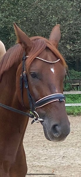 As we are downsizing our stock, we are reluctantly putting our beautiful Hanoverian mare Fine up for sale. Fine is an elegant dark chestnut with a height of 165 cm and is a great horse for leisure riders. She is a reliable companion both in the field and in the riding arena, but she is not suitable for competitions. She is accustomed to being ridden out alone with dogs. Fine is well-trained and has a strong nerve. She can be loaded without any issues (even alone) and is farrier-friendly.