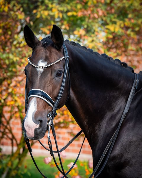 Don Schurfe’s Mare is an impressive Hanoverian mare with excellent dressage aptitude and remarkable rideability, qualities rarely found together. As a direct daughter of the exceptional sire Don Schufro, out of a Lauries Crusador xx dam, she combines elegant movement, willingness to perform, and a clear-minded temperament at the highest level. The mare is currently reliably competing in the M class and will be specifically prepared for her first starts in the advanced level during the upcoming winter season. She masters all movements confidently and consistently demonstrates a reliable work ethic. She exhibits a light, steady contact and can be ridden confidently and delicately even by amateurs. In daily handling, she proves to be absolutely balanced and resilient—whether at competitions, on the training ground, in the field, or during gymnastic work over poles. She is familiar with paddock and pasture and always friendly and uncomplicated. A true dream horse for riders seeking quality, character, and rideability in one animal.