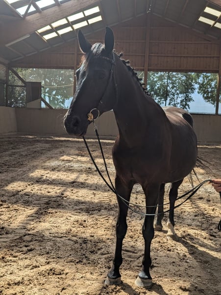 Bella is a large-framed mare with good basic gaits. She is in foal to Pelè and has a very successful filly, Beifuß, by Nairobi de Muze. Bella has a strong character and requires consistent but fair handling. With us, she spends the day outside and is stabled at night. She would also be happy to live in a loose housing system. In her box, she weaves if her schedule is not maintained. If you are interested, I am happy to answer any further questions. She has NOT competed at shows. The price refers only to the mare, not to the foal!