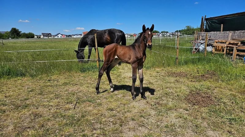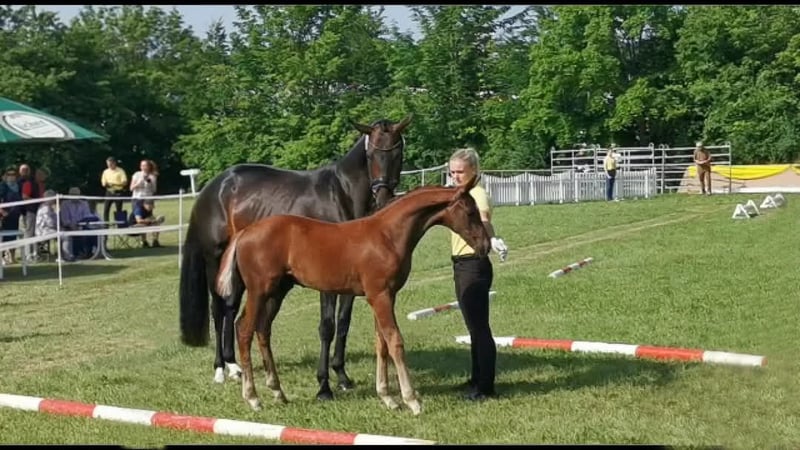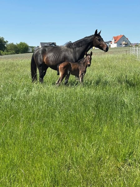 Zum Verkauf steht meine 12 jährige Hannoveranerstute "Daisy Deluxe" von Desiderio x Samarant. Daisy zeichnet sich durch ihre enorme Bewegungsgüte und eine unglaublich tolle Vererbung aus. Sie hat bei allen Bedeckungen (Natursprung und Frischsperma) sofort aufgenommen und drei überdurchschnittliche Fohlen zur Welt gebracht. Sie hat ein sehr aktives, kraftvolles Hinterbein, Vorderhandfreiheit und eine schön angesetzte Halsung. Im Typ ist sie modern und ausgesprochen elegant. Sie gibt ihren Fohlen ihre Leistungsstärke, Eleganz und natürliche Bergauftendenz mit überdurchschnittlichen Bewegungen mit. 1. Fohlen 2020: HF von METTEUR, unglaublich gangstarkes Fohlen, sehr rittig und kopfklar In seiner ersten Turniersaison 2025 Dressurpferde A und L siegreich 2. Fohlen 2021: HF von DON KENNEDY, Endring bei der zentralen Fohlenschau Hessen 2021, sehr schick im Typ mit überdurchschnittlichen Bewegungen und besonders hervorzuhebender Rittigkeit 3. Fohlen 2025: SF von DIAMANTENGLANZ, sehr gelungenes, korrektes und gangstarkes Stutfohlen mit schöner Halsung und schickem Kopf 2. Platz Fohlenschau Fritzlar Trotz ihres Stockmaßes von 1,64 m vererbt Daisy sich nicht klein. Charakterlich ist sie sehr menschenbezogen und anhänglich. Sie liebt Kinder und freut sich über jede Zuwendung. Sie ist immer fleißig und leistungswillig. Unter dem Sattel ist sie durch schlechte Erfahrungen sensibel, möchte aber alles richtig machen. Auf Grund dessen ist sie reiterlich nicht für Anfänger geeignet. Sie benötigt einen Reiter, welcher ihr Ruhe und Sicherheit bietet. Im Gelände ist sie sehr brav. Kinder hat sie bisher immer lieb und geduldig auf ihrem Rücken getragen. Bei einem Unfall in der Box im Januar 2023 hat Daisy sich das Kreuzband angerissen. Sie ist derzeit (noch) nicht wieder sportlich reitbar, weshalb ich sie als Zuchtstute oder Freizeitpartnerin abgebe. Sie wird nur in gute, verantwortungsvolle Hände gegeben. Gerne kann ich weitere Bilder und Videos versenden und am Telefon mehr über Daisy erzählen. Bei Interesse freue ich mich auf Ihre Kontaktaufnahme, um weitere Details zu besprechen und einen persönlichen Eindruck zu vermitteln.