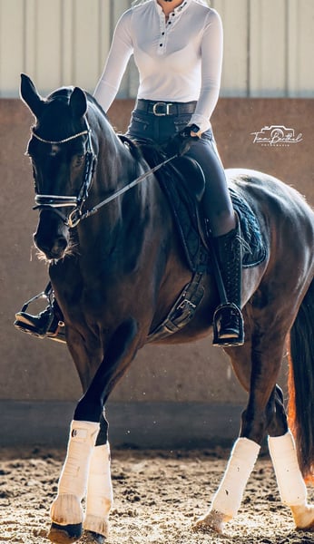 For sale is a 14-year-old dark bay mare by Lord Lauri x His Highness, standing approximately 1.67 meters at the withers. She has been gently trained up to the Advanced level and has achieved success up to S class. What makes this mare so special is not only evident under saddle. It begins with her incredibly charming and affectionate character and is complemented by her three very expressive basic gaits. In everyday handling, she is very straightforward and always manageable. She interacts kindly with her fellow horses. She is accustomed to stable life and her daily turnout on pasture or paddock. Loading and farrier visits are completely hassle-free for her. Even in unfamiliar surroundings, she remains calm and well-behaved. Every day, she impresses with a positive and motivated attitude. She wants to please and always enjoys her work. She is equally easy to ride in a snaffle bit or on a double bridle. She is never mean or grumpy. Her stunning appearance is an added highlight. She is very expressive and has a striking look that immediately catches the eye. This mare is a very honest partner, making her especially suitable for nervous, insecure, or young riders who want to learn and grow with her. She is currently in professional training. The mare is healthy and comes with a TÜV inspection from 2023. This is not an urgent sale. She is being offered solely due to lack of time to ensure she finds a good new home. Only inquiries by phone will be answered, but we are happy to do so. :-) Location of the horse: Jüchen