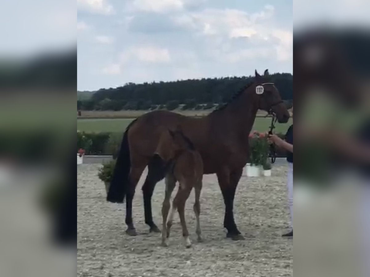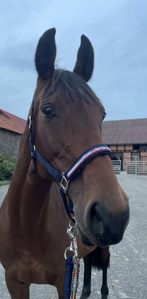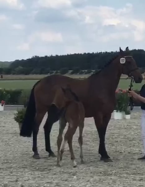 C'est la vie is a beautiful, loving, and people-oriented mare. She is being sold due to extensive breeding. The mare is in foal to Ogano Sitte, with an expected foaling date of May 12, 2025. If desired, she can remain in her familiar environment until she foals. The mare herself is "not too big," but when I purchased her in the fall of 2022, I viewed her offspring and believe that all are "big enough" or will be. My foal from 2024 out of this mare by Jasper is also large. C'est la vie sustained an injury to her cervical vertebrae as a young horse and therefore was only briefly in sports. She herself has placements up to M* level. The mare spends the winter in a group on a paved paddock with hay racks all day and is in a box at night. In the summer, she is accustomed to all-day pasture turnout. The mare and foal can also be purchased separately if desired (Price: Mare €13,000 + Foal €10,000, each including 19% VAT).