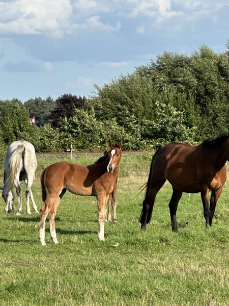 C'est la vie is een prachtige, lieve en mensgerichte merrie. Ze wordt verkocht vanwege uitgebreide fokplannen. De merrie heeft op 09-05-2025 een sympathiek en mooi getekend veulen van Ogano Sitte ter wereld gebracht (op de foto/video 12 uur oud). De merrie zelf is niet "te groot", maar bij de aankoop in de herfst van 2022 heb ik haar nakomelingen bekeken en ben ik van mening dat ze allemaal "groot genoeg" zijn of zullen worden. Mijn veulen uit 2024 van deze merrie van Jasper is ook groot. C'est la vie heeft als jong paard een blessure aan de halswervel opgelopen en was daardoor zelf maar een zeer korte tijd in de sport. Ze is zelf tot M* geplaatst. De merrie staat in de winter de hele dag in een groep op een verharde paddock met hooinetten en 's nachts in de stal. In de zomer is ze gewend aan weidegang gedurende de hele dag. Merrie en veulen kunnen eventueel ook afzonderlijk worden aangeschaft (prijs: merrie 13.000 EUR + veulen 10.000 EUR, beide inclusief 19% btw).