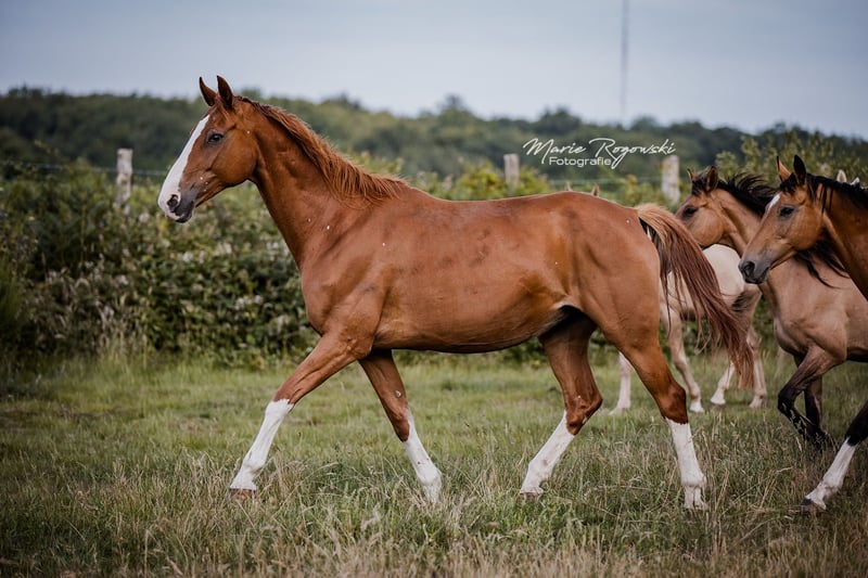 Diva 585 jest jedną z nielicznych córek DANCIER (De Niro - Lancier), co mówi samo za siebie. Po stronie matki, po World Cup - Grande, rodowód nie pozostawia nic do życzenia. Klacz przejęliśmy w 2015 roku od (nierzetelnego) klienta, który nabył ją od stajni jeździeckiej. Klacz była z powodzeniem pokazywana przez jeźdźców amatorów aż do zaawansowanego poziomu ujeżdżenia w młodym wieku (lista rejestracyjna FN I dla niemieckich koni jeździeckich 2014) i miała już tam ogierka. W naszym programie hodowlanym genetycznie rozjaśnionych koni sportowych, urodziła jeszcze trzy wspaniałe ogierki w 2018 (palomino <170cm, Oldenburg), 2020, 2022 (patrz galeria zdjęć) z różnych kojarzeń przez naturalną hodowlę. Jest bezproblemową matką. Źrebięta są zawsze bardzo popularne. Może być kryta jednym z wielu naszych ogierów. Diva jest kasztanem z dodatkowym wariantem genetycznym "birdcatcher spots". Karta DNA dostępna. 2014 zarejestrowana w Księdze Stadnej I Westfalskiej Księgi Stadnej. 2019 dalsza rejestracja w księdze stadnej I Związku Oldenburgów. Uznany również przez Zangersheide w 2020 roku. 2021 IFCE zarejestrowana i uznana jako klacz hodowlana we Francji (Stud-book de reproduction: FACTEUR DE SELLE FRANCAIS). Nasze stado hodowlane żyje na zewnątrz przez cały rok na bardzo rozległych użytkach zielonych. Diva jest obecnie główną klaczą odpowiedzialną za prawie 40 klaczy w wieku od 1 do 24 lat, ze stałą dziewczyną. Zawsze bez problemów ukończyła kilka długodystansowych podróży ciężarówką. Oddajemy ją do stałego ruchu. Przy starannej, profesjonalnej pielęgnacji kopyt może być ponownie użytkowana. Możliwe regularne przycinanie kopyt, odrobaczanie, szczepienia - aktualizowane na życzenie - a także leczenie stomatologiczne i osteopatia. Sprzedaż prywatna po osobistym spotkaniu. Zakwaterowanie jest zapewnione bezpłatnie.
