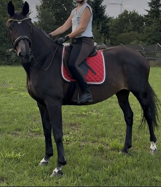 My beloved 17-year-old mare (Hofrath x De Niro) is looking for a lovely new home. She has had three wonderful foals so far (with her previous owner), the most recent in 2024, and since August, I have been riding her sporadically in the field or on the pasture, as well as lunging. She is well-behaved in handling, and the farrier is no problem. Under saddle, she still needs a bit more training; I have only worked on canter at the lunge so far. Her trot is lively and comfortable. Unfortunately, I lack the time for more intensive training, as I can only ride her irregularly—sometimes several times a week, but other times not for several weeks. She needs consistent work, especially after her foal rest, to get her properly forward and engaged. She is 1.73 meters tall. If everything fits, her companion (a 20-year-old gelding, limited riding ability) can also be rehomed together. Place before price, we look forward to getting to know you.