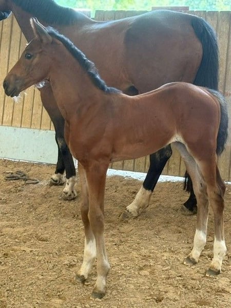 This friendly young mare, born on May 28, 2025, impresses not only with her excellent temperament but also with her movement, where her talents in the show jumping course are already evident, especially her canter should be highlighted. Her sire, Easy Jet, recently gained attention with his foal evaluation, where his offspring were described as long-legged, harmoniously built, with beautiful faces. In movement, they are relaxed and active, as one would expect from a foal destined for show jumping, according to breeding manager Per Eitenmüller. Easy Jet also demonstrates his talent in sport, currently earning gold ribbons in development classes as a four-year-old. Her dam, Violetta, already produced a successful 1.40 m show jumper, Budak's Casina Berlin. The dam line also includes the approved stallions Chaloc and Columbus Z.