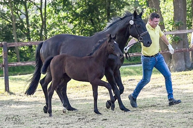 "Gloria ZS" Black filly, born 19.04.205 Grey Butt-Weltrum-Natiello XX It doesn't get any fancier than this – with the pedigree providing the best prerequisites for a dual talent. The full brother was the reserve winner at the free-jumping competition in Hepstedt, and the half-sister by Vidar – now 5 years old – is winning one dressage test after another. The foal has beautiful movements. We don’t need to say much about the sire – he is making his mark. The dam received a score of 7.75 for rideability at the SLP. The dam and granddam are registered in the performance mare book of classes "A" and "D" with the FN in Warendorf – the same applies to the great-granddam. The granddam produced 14 foals in 15 breeding years – exclusively blacks – of which 7 were sold through the Verden foal auction – they are now competing in dressage up to class "S" – unfortunately very few in Germany. On the maternal side, there is the same bloodline as the legendary stallion "De Niro" – Akzent II-Waidmannsdank XX-Ferdinand – so what more could one want – an offer for sport and breeding. The foal can stay for raising at the breeder's stable. If you are interested, please feel free to contact me. We do not breed show jumpers – we breed horses with dual talent! Wilhelm Steffens, Ehebrock 3, 27412 Breddorf Tel. 04285/734 or 0160/5312125 E-Mail: w.steffens@grewe-