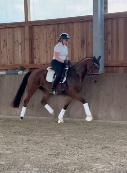 For sale is an exceptionally charming and talented 3-year-old mare with an excellent dressage pedigree: Scolari x Hohenstein x Donnerhall – a lineage that combines rideability, presence, and quality. She currently measures approximately 160 cm and shows a very harmonious development. Her very good walk is particularly noteworthy – relaxed, supple, and always in rhythm. She also impresses in the trot with a good range of motion, while the canter is uphill and very powerful. The mare is very light in the mouth, pleasant in the contact, and well-ridden from the seat. She has been gently started under saddle and can already be ridden effortlessly by well-educated young riders. In daily handling, she is always well-behaved and uncomplicated, loading easily, and with X-rays showing no findings, she is now waiting for her new home. A great young horse for ambitious riders that is now ready to be further developed.