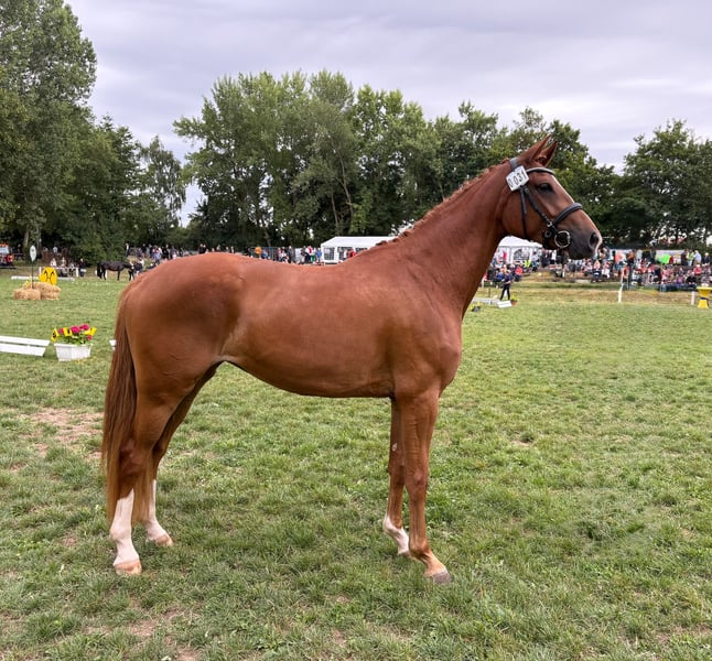 Wir bieten hier direkt aus Züchterhand eine bildschöne und hochtalentierte Dressurnachwuchsstute für den ambitionierten Reiter an. Die Stute überzeugt durch ihr überragendes Gangpotential bei hervorragender Arbeitsstellung und einem außerordentlich gutem Nervenkostüm. Dazu ist sie dem Menschen gegenüber extrem zugewandt und liebt es betüddelt zu werden. Die Stute wurde im Frühjahr sehr gut angeritten (5 Monate) und hatte dann nocheinmal 4 Monate Weidepause um weiter reifen zu können. Sie befindet sich jetzt wieder in Arbeit. Bereits im Frühjahr wurde das Pferd auf einer Richterschulung gezeigt und hat dort auf ihre Gänge von beiden Richtern WN über 8 erhalten ! Die Stute geht dazu super im Gelände und bereitet auch hier ihrem Reiter ganz viel Freude. Verladen, Schmied etc. - alles Problemlos. Die Stute wurde auch mit besten Resultaten vollständig geröngt inkl. Rücken - die Bilder stellen wir gerne zur Verfügung. Nun zum Manko : Die Stute koppt seit Kurzem. Wir denken, dass sich das Verhalten durch eine entsprechende Haltung (ggf. Offenstall), wieder abstellen lässt. Bei uns hat sie im Offenstall nicht gekoppt, jedoch im Ausbildungsstall angefangen.Aus diesem Grund geben wir die Stute zu einem reduzierten Preis ab. Wer ein wirklich talentiertes Nachwuchspferd sucht, aber preislich eingeschränkt ist, hat hier die Gelegenheit ein wirklich tolles Pferd für die Zukunft zu bekommen.