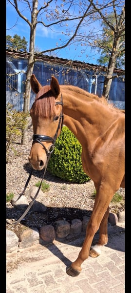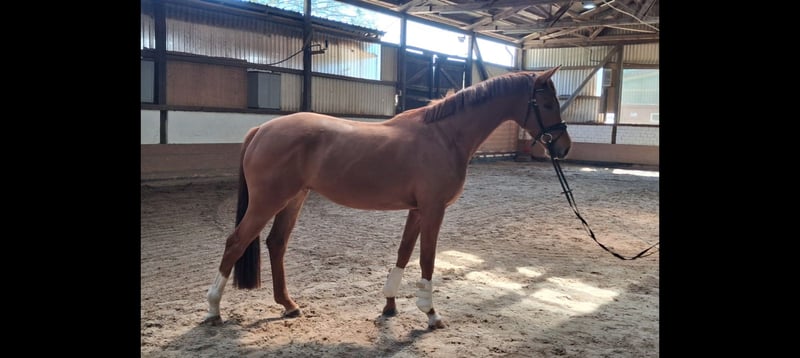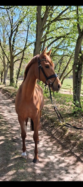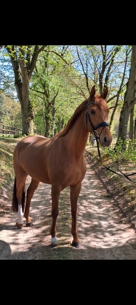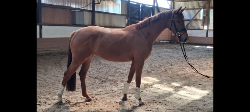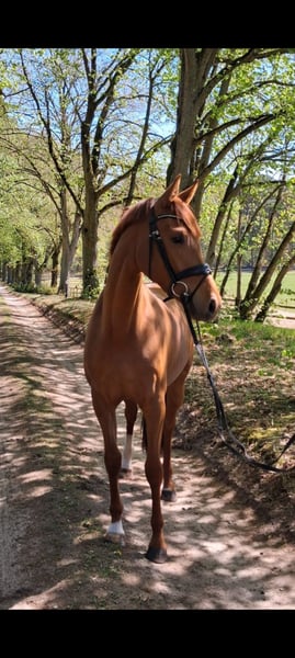 Charmante, bildhübsche 3-jährige Hannoveraner Fuchsstute vom Bundeschampion, S-Dressur Sieger und Rittigkeitsvererber Va`Pensiero x Sansisco x Rubinstein I im mittleren Rahmen stehend mit einwandfreiem Interieur und 3 guten GGA zu verkaufen. Ein unkompliziertes Pferd für jedermann, ob zum selber ausbilden oder auch zum Züchten. Die Stute ist anlongiert, lebt im Herdenverband, kennt Boxenhaltung sowie Offenstallhaltung und täglichen Weidegang. Sie ist schmiede- und verladefromm und ekzemfrei. Halbbruder der Mutter ist bis S-Dressur siegreich Mutter selbst ist sehr fruchtbar TÜV vorhanden Direkt vom Züchter Videos können per WhatsApp verschickt werden (01735274764)