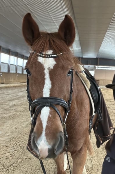 Wir bieten hier direkt aus Züchterhand eine bildschöne und hochtalentierte Dressurnachwuchsstute für den ambitionierten Reiter an. Die Stute überzeugt durch ihr überragendes Gangpotential bei hervorragender Arbeitsstellung und einem außerordentlich gutem Nervenkostüm. Dazu ist sie dem Menschen gegenüber extrem zugewandt und liebt es betüddelt zu werden. Die Stute wurde im Frühjahr sehr gut angeritten (5 Monate) und hatte dann nocheinmal 4 Monate Weidepause um weiter reifen zu können. Sie befindet sich jetzt wieder in Arbeit. Bereits im Frühjahr wurde das Pferd auf einer Richterschulung gezeigt und hat dort auf ihre Gänge von beiden Richtern WN über 8 erhalten ! Die Stute geht dazu super im Gelände und bereitet auch hier ihrem Reiter ganz viel Freude und zeigt sich auch hier schon äußerst Nervenstark. Verladen, Schmied etc. - auch alles Problemlos. Auch das Überwinden von Hindernissen ist für ein Dressurpferd nicht übel.... Die Stute zeigt sich dazu in Bezug auf fliegende Wechsel schon jetzt äußerst talentiert (sh. Video von letzter Woche) und meistert auch diese Aufgabe schon jetzt spielerisch. Als "Bonus" wurde "Flashy" wurde Anfang 2025 mit besten Resultaten vollständig geröngt (inkl. Rücken) - die Bilder stellen wir gerne zur Verfügung. Nun zum Manko : Die Stute koppt seit Kurzem. Wir denken, dass sich das Verhalten durch eine entsprechende Haltung (ggf. Offenstall), wieder abstellen lässt. Bei uns hat sie im Offenstall nicht gekoppt, jedoch im Stall vor Kurzem angefangen.Aus diesem Grund geben wir die Stute zu einem für ihre Qualität deutlich reduziertem Preis ab. Wer ein wirklich talentiertes Nachwuchspferd für höhere Aufgaben sucht, aber preislich eingeschränkt ist, hat hier die Gelegenheit ein wirklich tolles Pferd für die Zukunft zu erwerben ! Bitte beachten Sie, dass wir uns über seriöse Anfragen immer freuen, jedoch mögen Reittouristen von einem Kontakt Abstand nehmen.. Aufgrund schlechter Erfahrungen, berechnen wir nun für Probereiten (zum Schutz des Pferdes) = 30 Euro, die wir selbstverständlich beim Kauf zurückerstatten werden.
