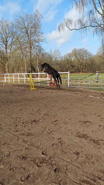 Ich habe die Stute selber erst letztes Jahr gekauft. Kurze Zeit später wurde ich Schwanger mit Zwillingen. Diese Stute ist so lernbegierig das es zu schade wäre das sie nur herumsteht. Sie sollte eigentlich mein Nachwuchspferd werden, aber da würde mir definitiv die Zeit fehlen. Sie wird jeden Tag weiter gearbeitet. Die Stute ist super anhänglich und schmust gerne. Sie hat so flinke Vorderbeine beim springen. Es ist wirklich schade das ich sie abgeben muss, aber sie würde sich bei einem Reiter/Reiterin wohler fühlen wenn sie gearbeitet wird. Ich habe sie 3 oder 4 Monate lang longiert um sie auch richtig auf das reiten vorzubereiten. Danach habe ich mich (Schwanger) draufgesetzt. Ich hatte immer ein sicheres Gefühl bei ihr, sonst hätte ich es nicht gemacht. Nach dem 4. Mal draufsitzen hatte ich kurz das Bedürfnis eine schrittrunde im Gelände zu machen. Sie ist einfach so brav. Man muss sie nicht ablongieren. Bei reiten hat sie genügend go und ist nicht triebig. Wir haben auch keine Halle und sie wurde immer draußen geritten neben einer Straße. Das stört sie nicht. Wir waren schon zwei mal im Gelände unterwegs. Ich kann mir jemand für sie vorstellen der gerne im hohen springsport reiten möchte aber auch in der Dressur oder Vielseitigkeit reitet. Aber auch kann ich mir einen jungen ambitionierten Reiter vorstellen da sie so brav ist. Die Stute ist so wunderschön. Einfach anschauen und verlieben.