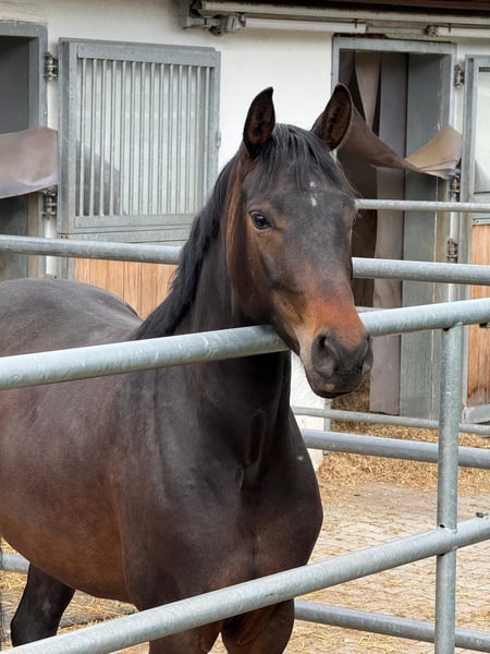 Eine wunderschöne, 2020 geborene braune Stute von Vivaldi x Don Index. Diese charmante Dame überzeugt nicht nur durch ihre ansprechende Abstammung, sondern auch durch ihren liebevollen und umgänglichen Charakter. - Farbe: Braun - Abstammung: Vivaldi x Don Index - Gangarten: 3 schöne Grundgangarten Sie zeigt sich im Umgang als äußerst lieb und verträglich. Zudem ist sie schmiedefromm und verladefromm. Ich kann sie mir sehr gut in einem offenstall vorstellen da sie sich sehr gerne bewegt und andere Pferde sehr liebt. Sie ist aber kein Kleber. Also sie geht auch gut von anderen Pferden weg und in der Halle alleine ist auch kein Problem. Sie ist aber kein Anfänger Pferd sie braucht erfahrene Hände und jemand der viel Zeit und konsequent sie ausbildet. Sie läuft gerne hat viel power ist aber ein sehr robustes Pferd. Kern gesund!! Ich muss mich aus zeitlichen Gründen von ihr trennen. Man muss sich ausgiebig mit ihr beschäftigen und das kann ich ihr leider nicht bieten. Sie kennt Sattel Trense, Reiter an der Longe in allen 3 Grundgangarten. Sie wurde vorletztes Jahr angeritten und dann wieder auf die Koppel gestellt wegen Zeitmangel. 9🥕🥕🥕 Bei Fragen gerne 01602294861 oder freilaufende Videos