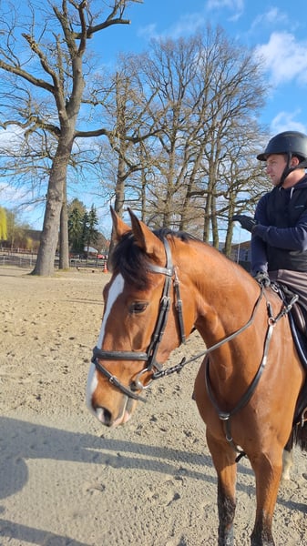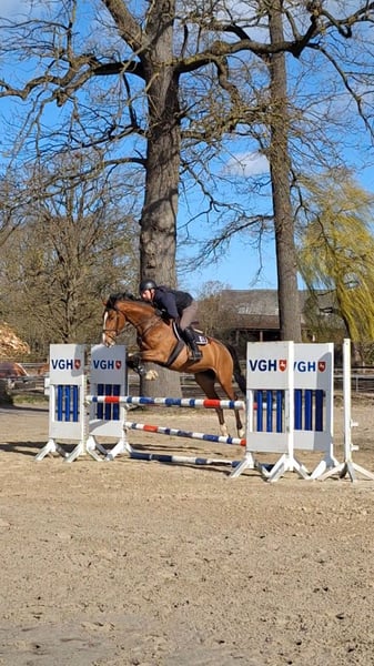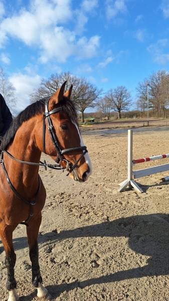 Our Franzi is a sporty mare suitable for amateur riders. She has a natural talent for jumping and three very good basic gaits. She is a thoughtful, calm horse that aims to build trust with her handler. She is experienced in competitions and is uncomplicated when it comes to the farrier, deworming, and daily handling. We are breeders and trainers. She was raised with us in a mixed herd and was gently backed at the age of four.
