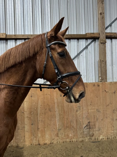 Eight-year-old Hanoverian mare with a chestnut coat by Borsalino out of Wilawander xx, for sale. A versatile leisure horse suitable for a sensitive rider. She enjoys hacking and is comfortable over small jumps.