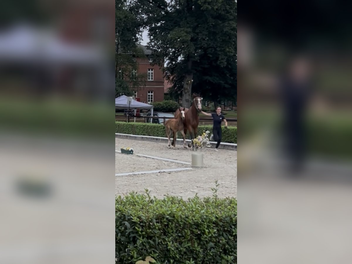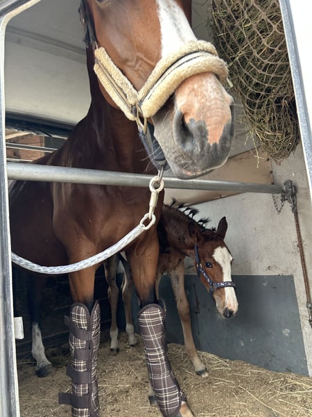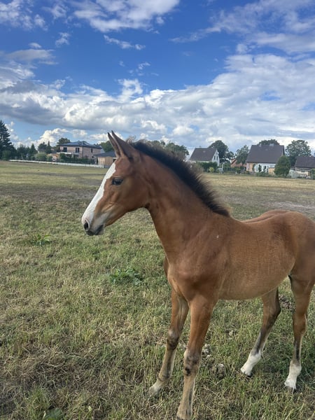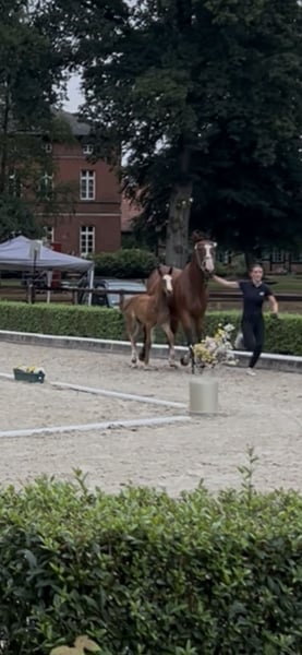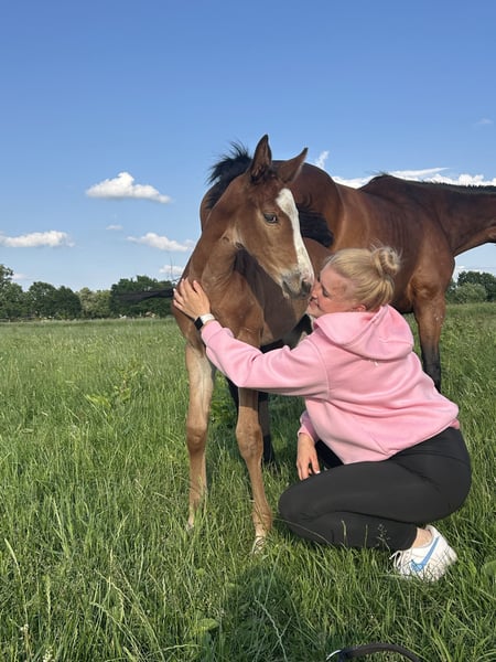 We are offering our "Sunny" for sale if everything fits. Sunny was born in May of this year. She is a very curious but shy foal and tends to be lower in the pecking order. She is accustomed to 24/7 pasture turnout, overnight stabling, and mud paddocks. She leads well with a halter, is familiar with the farrier, and has been lunged on the riding arena. This year, she has participated in two foal shows and received very good evaluations. We would consider selling her for 2 to 2.5 years with a purchase option. Sunny is by Grey Butt out of Captain Cooper. Her dam is with us and has competed in dressage up to L** level and jumping up to M** level. Sunny is used to children, tractors, dogs, and grooming. If Sunny has sparked your interest, please send me a short message telling me how you would keep her. We would prefer her to be located no more than 200 km from Winsen (Aller). Further details and videos are available via WhatsApp! We look forward to hearing from you! :)