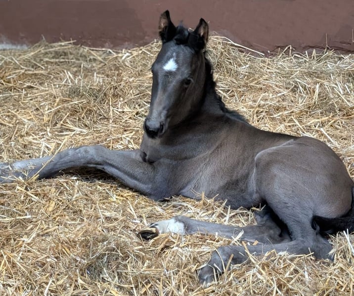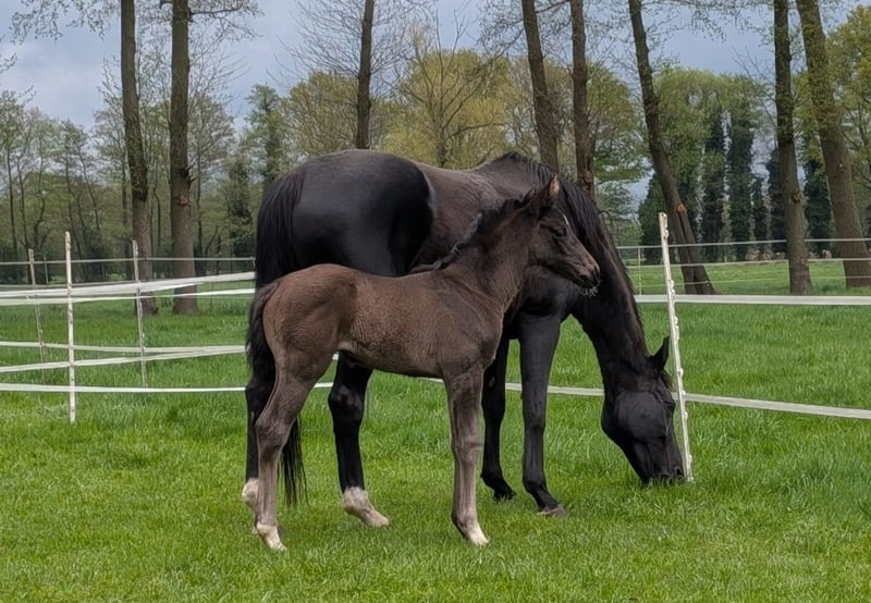 Hannoverian filly black by Extreme US out of Deelayla by De Niro x Weltmeyer born on April 1, 2025. Eliana is a beautiful and very correct filly. The mother Deelayla by De Niro x Weltmeyer was successful in sport and has already produced top offspring: The oldest foal has won M** and is now in breeding - in different years she presented the 4th and 5th best colt at the German Foal Championship in Lienen. All offspring are beautiful and have a clear mind. Elania is growing up in a foal group, is led to the pasture daily with a halter and lead rope, is of course dewormed and has been introduced to the farrier. Anyone who would like to get to know Elania is always welcome. Silke Kuhlenkamp Holter Weg 9a 33397 Rietberg-Varensell Mobile: 0170/895 86 21 www.spitzenfohlen.de www.germantopfoals.com