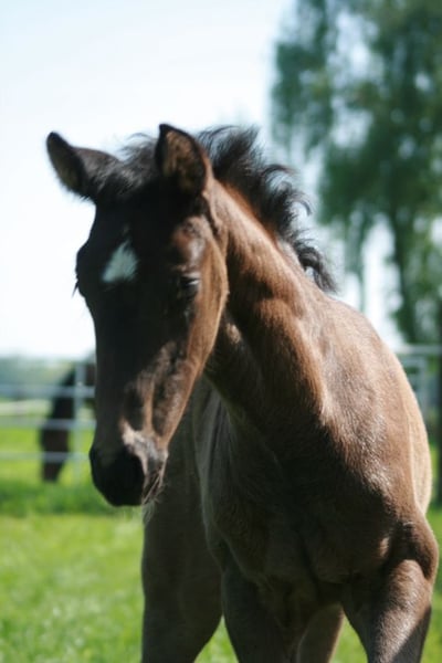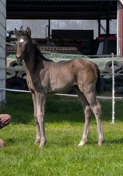 Poulain femelle hanovrien noir par Extreme US, de Deelayla par De Niro x Weltmeyer, né le 01.04.2025. Eliana est un poulain femelle très beau et très correct. La mère, Deelayla par De Niro x Weltmeyer, a été elle-même performante dans le sport et a déjà donné naissance à des descendants de premier choix : Le plus ancien des poulains a remporté un M** et est maintenant dans l'élevage - au cours de différentes années, elle a présenté le 4ème et le 5ème meilleur poulain mâle au Championnat des poulains allemands à Lienen. Tous les descendants sont très beaux et ont un bon caractère. Elania grandit en compagnie de poulains, elle est conduite quotidiennement au pré avec un licol et une longe, elle est bien entendu vermifugée et a été présentée au maréchal-ferrant. Quiconque souhaite rencontrer Elania est toujours le bienvenu. Silke Kuhlenkamp Holter Weg 9a 33397 Rietberg-Varensell Portable : 0170/895 86 21 www.spitzenfohlen.de www.germantopfoals.com